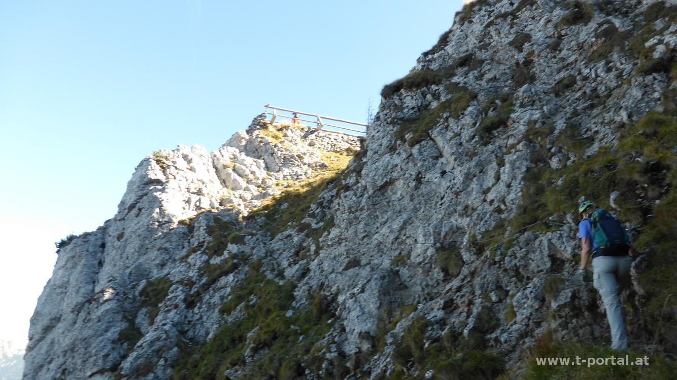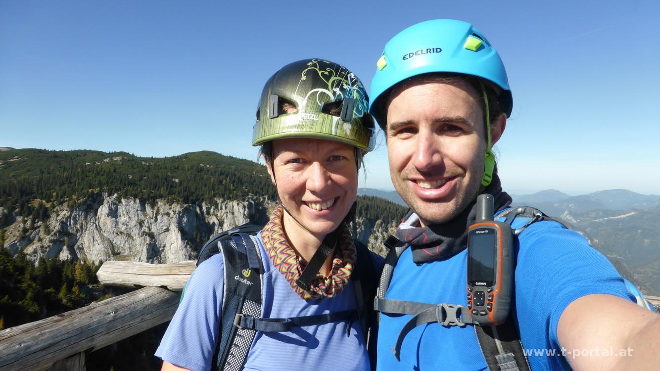 Die Leiter führt uns hinauf zum Steigbuch. Es folgt klassisches Seil-Steiggelände und zwischendurch Gehgelände mit packenden Tiefblicken. Weiter oben um das nächste Eck und zu weiterer Kraxelei. In der nächsten schrägen Passage höre ich den Wanderer hinter uns erzählen: "Da bin ich im Winter nicht raufgekommen. Bin irgendwo durch die Latschen gerade aufgestiegen - Todesängste hab ich gehabt - Todesängste!". Seine Begleiterin war glaub ich nur mäßig beeindruckt. Für uns geht es über ein etwas schräges und feuchtes Stück, wo uns zwei Wanderer im Abstieg entgegenkommen. Von hier ist es nicht mehr weit - nochmal ein paar Trittbügel und eine Querung nach links und wir erreichen den Ausstieg bei der Höllentalaussicht. Hier genießen wir nochmal den Blick ins Höllental und machen eine verdiente Rastpause.