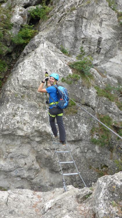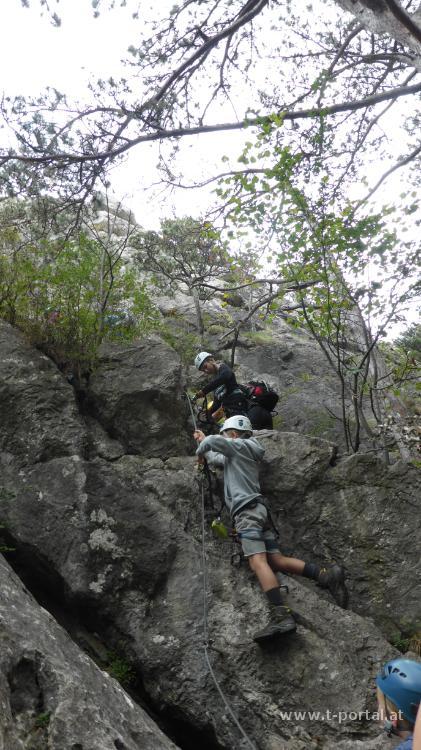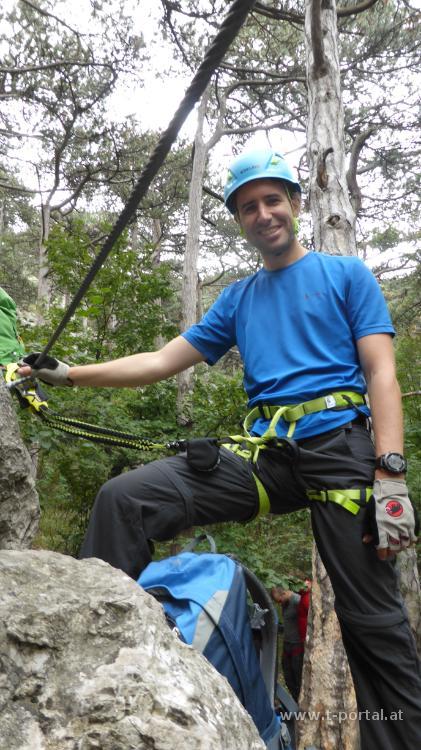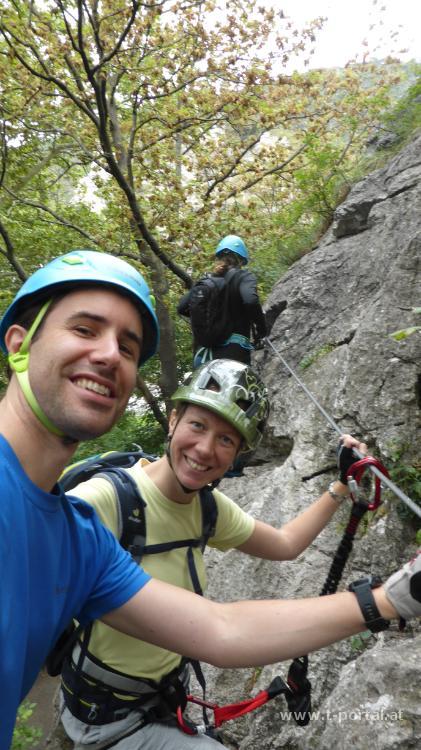 Schon öfter haben wir über Klettersteige diskutiert, für die man auch ein Klettersteigset braucht. Bis jetzt sind wir gemeinsam maximal B Steige ohne Sicherung gegangen. Zum Probieren nehmen wir auf der Reise in den Süden schnell den Mödlinger Klettersteig mit. Wirklich schwer ist da nur die Einstiegswand (B/C), als andere würden wir im Normalfall wohl ohne Sicherung gehen. Dafür kann ich etwas das Umhängen und Schieben/Ziehen der Karabiner üben.