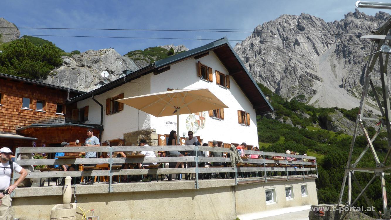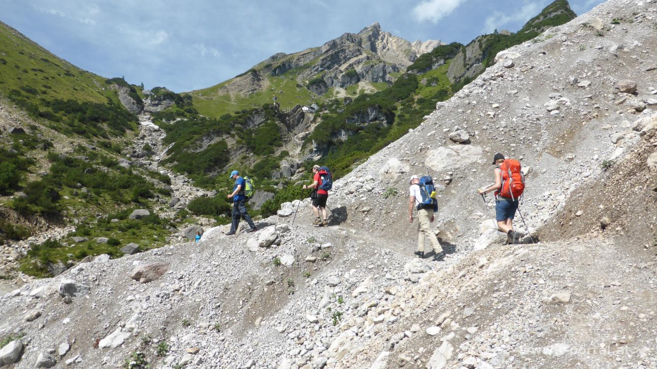 Wieder geht es entlang eines Lifts aufwärts bis zu einem Teich, hinter diesem nach rechts und nach Bachüberquerung zur Latschenhütte. Die Hütte hat unter der Woche geschlossen, wir pausieren trotzdem kurz und machen uns dann zum finalen Anstieg zur Muttekopfhütte, auf der wir die heutige Nacht verbringen werden. Die Straße führt uns bis zur Talstation der Materialseilbahn von der es nun über Felsen und Stein etwas mehr hinauf geht. Die Hütte rückt immer näher und bald halten wir den Stärkungsradler in den Händen.