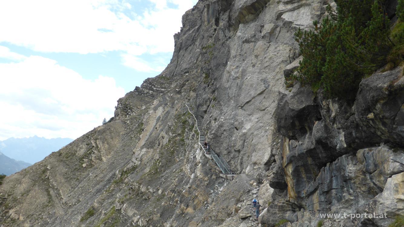 Nachdem wir noch genug etwas Zeit haben machen wir uns später noch auf den Weg zur nächsten Ausichtsplattform - dem "Adlerhorst". Am Drischlsteig geht es von der Hütte Richtung Süden. Es geht vorbei am Wasserfallklettersteig (leider gab es keine Klettersteigsets zum Ausleihen) und später über Treppen weiter aufwärts. Hier trafen wir auch eine Familie mit zwei Kleinkindern, diversen Taschen und zusammengeklappten Kinderwagen - wie man sich Touristen in Tirol eben vorstellt. Nach Besuch der Aussichtplatform gehen wir noch weiter zur Bergstation der Alpjochbahn und von dort rauf auf das vordere Alpjoch. Nachdem das Wetter schon schlechter wird, beschließen wir nicht weiter zu gehen sondern gehen am gleichen Weg zurück zur Hütte. Diese erreichen wir bei den ersten Regentropfen, Sekunden später schüttet es wie aus Kübeln. Nach ein paar Runden UNO geht's ab ins Bett.