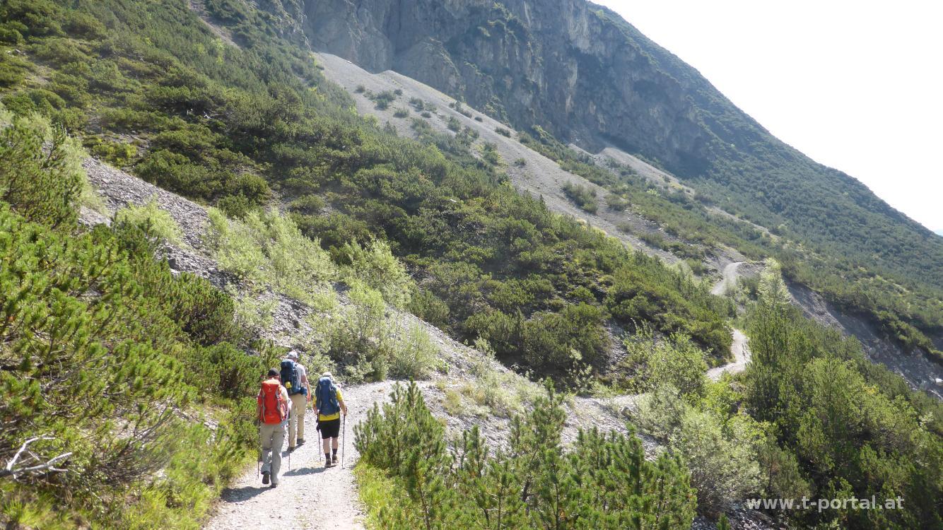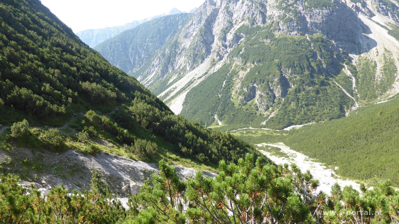 Der vierte Tag unserer Lechtalrunde sollte uns eigentlich von der Steinseehütte zum Württemberger Haus führen. Leider hat sich gestern jemand den Magen ziemlich verdorben und so entschließen wir uns solidarisch ins Tal abzusteigen. Von der Steinseehütte geht es auf geschottertem Wanderweg hinab in den Talschluss und dann immer dem Bach entlang talauswärts.