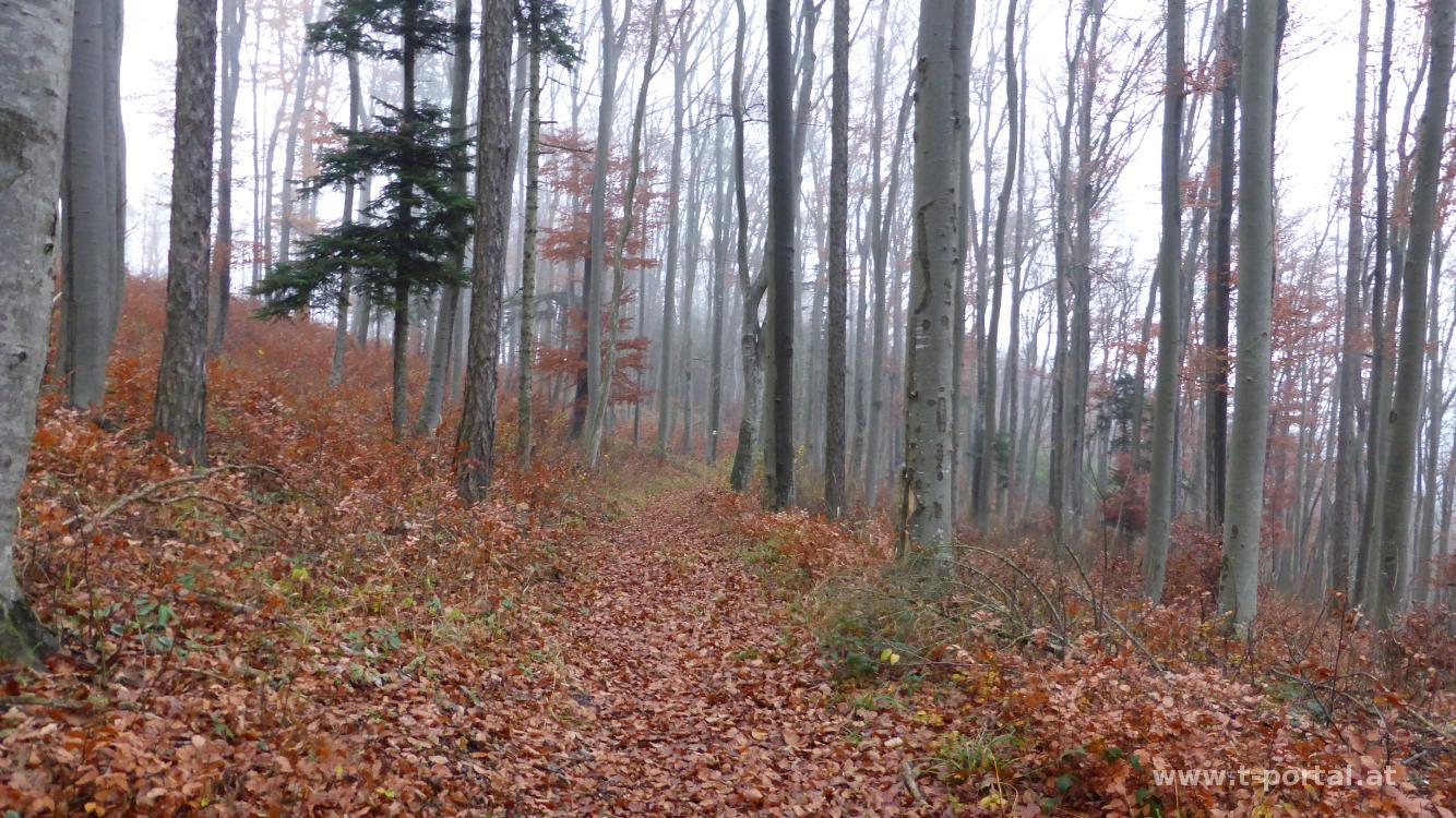 Am Kammweg geht es dann zurück. Zuerst am bekannten Weg bergab, dann folgen wir immer den Markierungen in Richtung Osten. Dabei kommen wir mit kurzen Gegenanstiegen am Mittagskogel und am Kienberg vorbei und steigen vor einem Rechtsknick nach links zu einer Forststraße ab. Laut Wanderführer gibt es hier einen Pfad, den hab ich schon beim letzten Mal nicht gefunden. Nun in einer langen Schleife auf einer Forststraße retour Richtung Altenmarkt. Vorbei am Sportplatz geht es in den Ort und durch diesen zurück zum Ausgangspunkt.