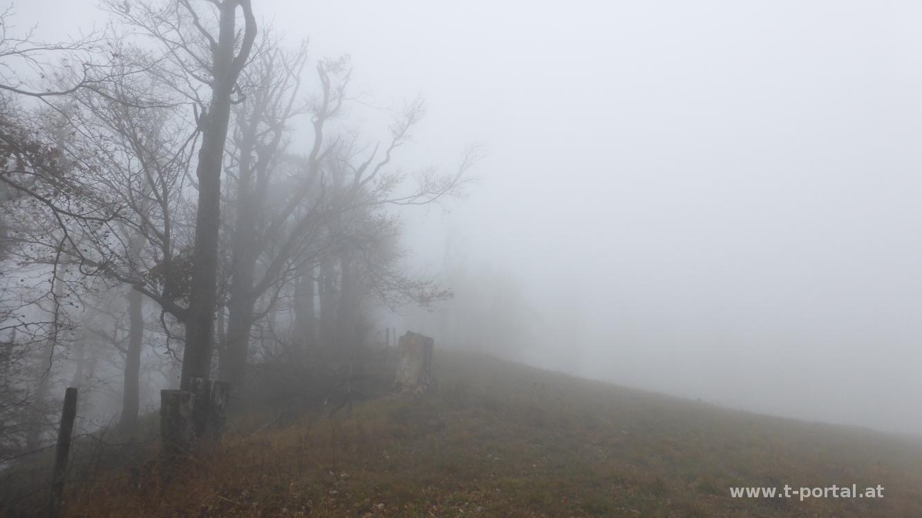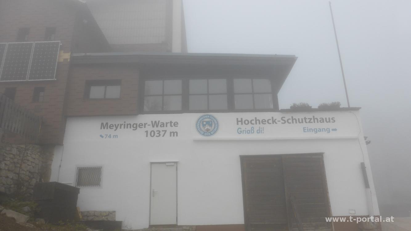 Die Umgebung versinkt immer mehr im Nebel und die Hoffnung, die Nebelsuppe zu verlassen schwindet, während wir an Höhe gewinnen. Es folgen noch einige Kurven, wir wandern am Wildenauer Brunnen vorbei und treffen später die Kreuzung mit dem Kammweg, auf dem wir später zurück gehen werden. Nun immer nach Westen zuerst am Forstweg, später etwas schmaler Richtung Gipfel. Im Nebel taucht irgendwann das Hocheck Schutzhaus auf, das seit April dieses Jahres wieder geöffnet hat (und auch noch bis 31.12., dann wieder ab Mitte März). Wir schauen noch kurz bei der Warte vorbei, verzichten aber aufgrund des Nebels auf die Wartenaussicht und kehren anschließend zur Stärkung ein.