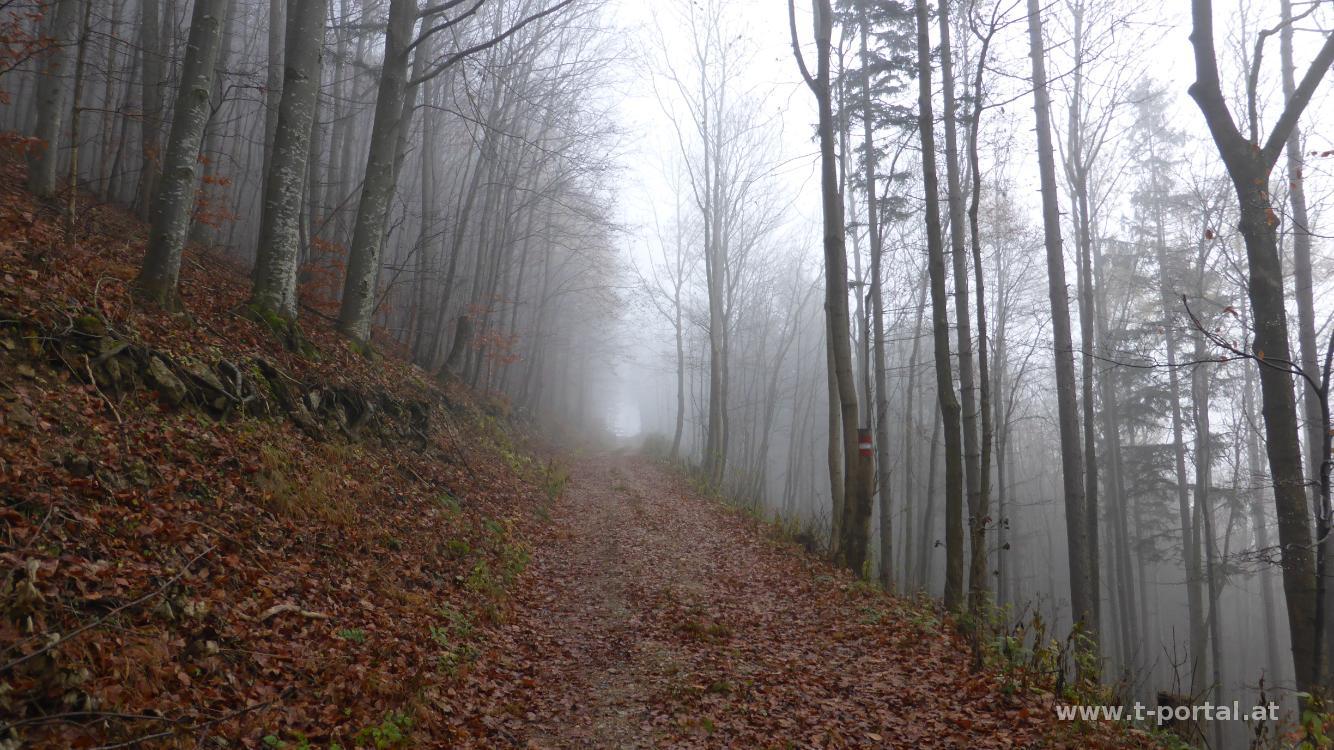 Zuhause ist es grau, aber laut Webcam sollte es weiter oben sonnig sein. Nachdem wir nicht all zu lange unterwegs sein wollen, entscheiden wir uns das Hocheck zu besuchen und erwandern die gleiche Route, die ich bereits vor drei Jahren gewählt habe. Wir parken unser Mobil bei der Feuerwehr in Altenmarkt und marschieren von dort gleich hinauf, über die ehemalige Bahntrasse und entlang einer Wiese weiter aufwärts. Anschließend wieder in den Wald, dort nach rechts auf die Forststraße und auf dieser gemütlich bergauf. Wir kommen am Heimkehrerbründl vorbei, kürzen anschließend ein Stück auf einem schmaleren belaubten Pfad ab und landen wieder auf der Straße. Nun auf dieser weiter, dann auch mal auf schmaleren Pfad durch eine Waldgasse und anschließend wieder auf der Straße immer der Markierung Richtung Hocheck nach.