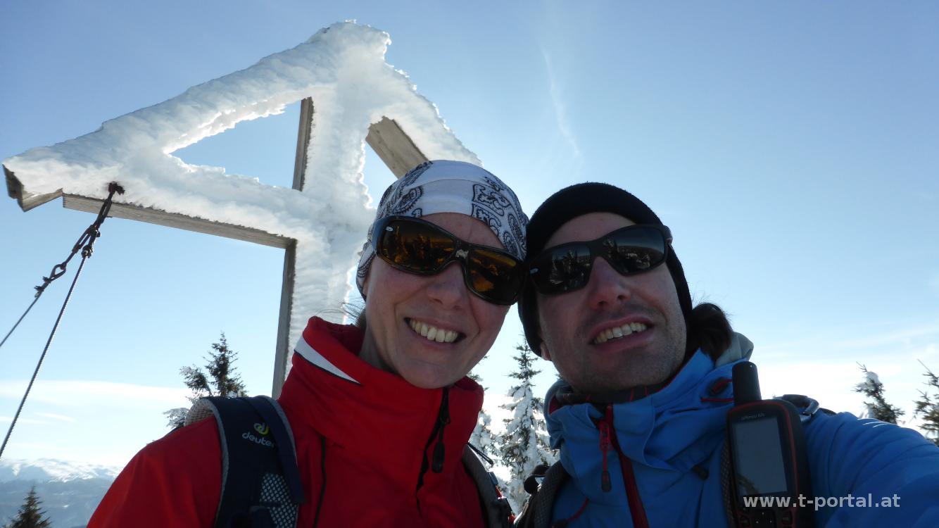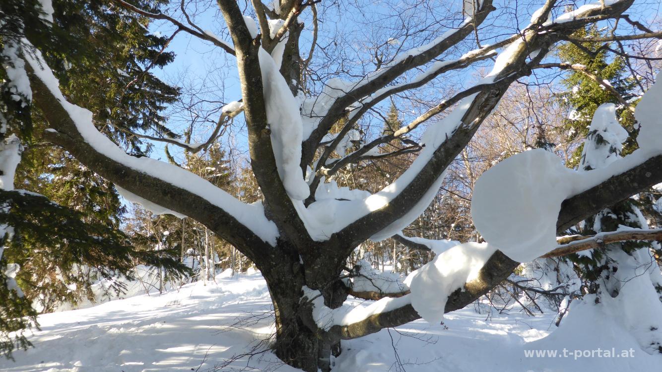 Nach der Schräglage stärken wir uns kurz und schlagen uns wieder in den Wald. Anfangs ist es noch immer etwas schräg, bald geht es etwas flacher dahin und dann gerade und steiler aufwärts. Nach einiger Plagerei haben wir auch hier die ersten Spuren in den Schnee gesetzt und erreichen eine Forststraßenquerung. Hier treffen wir auf zahlreiche Schneeschuh- und Skitourenspuren, die der Straße hinauf gefolgt sind. Wenig später sehen wir auch die nächsten Tourengeher den Weg hinauf kommen. Wir folgen den nun vorhandenen Spuren und steigen immer weiter auf. Die Sonne scheint zwischen den Bäumen und der zahlreich vorhandene Baumschnee sorgt für eine wunderbare Winterstimmung. Weiter oben queren wir nochmal die Straße und sehen zwischendurch schon die Gipfelwiese zwischen den Bäumen hervorglänzen. Wir mühen uns noch etwas und folgen dann dem eher flachen Hang zur verschneiten Waldfreundehütte. Hier bläst uns zwischendurch ein frisches Lüftchen an, weiter oben ist es zwischen den Bäumen aber wieder windstill. Wir wandern links hinter der Hütte vorbei und wenig später stehen wir beim Gipfelkreuz des Obersberg. Bei traumhaften Panorama genießen wir unsere Jause und sitzen etwas länger in der Sonne. Irgendwann wir es uns dann doch zu kalt und wir beginnen den Rückweg.