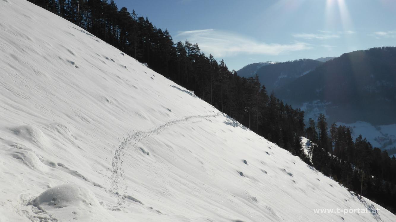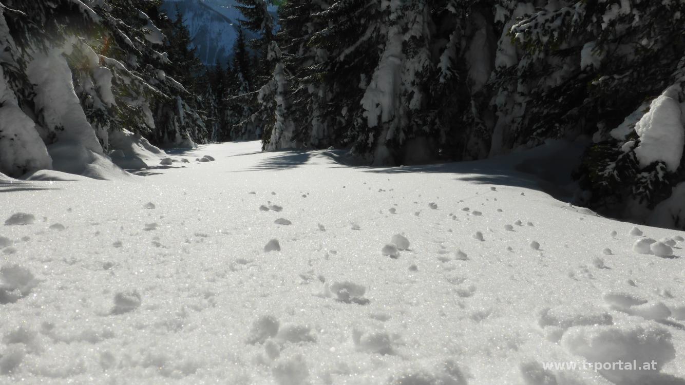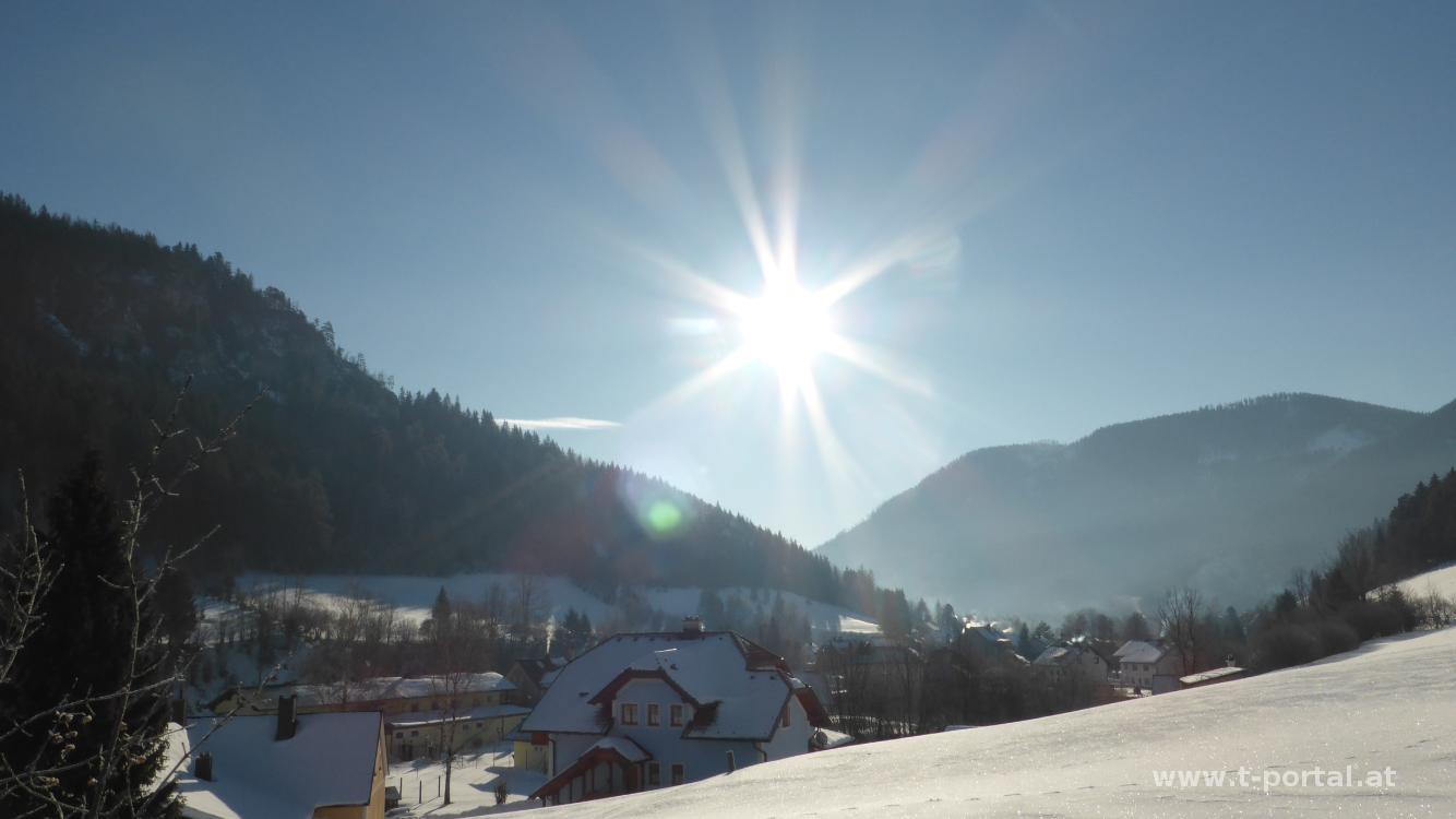 Das Wetter ist schön, die Lawinenwarnstufe ist wieder auf einem vernünftigen Niveau und wir brauchen frische Luft - also rein ins Auto und rauf auf die Autobahn. Hier gibt's jedoch keine frische Luft. Also weiter fahren, abbiegen, weiterfahren, abbiegen und siehe da - der Schnee wird mehr, der Himmel wir blau und das Thermometer zeigt -13°. Als wir in Schwarzau in Gebirge los marschieren ist es nicht ganz so kalt, so schnallen wir uns die Schneeschuhe an die Füße und bald wir uns wärmer. Von der Kirche geht es nach rechts auf den Wanderweg und nach dem ersten Stück über die Wiese bald in den Wald. Hierbei folgen wir einigen bereits vorhandenen Schneeschuhspuren. Der Schnee ist recht hart und somit sinken wir nur selten etwas ein. Nach dem ersten längeren Anstieg und einiger Kehren im Wald erreichen wir die Forststraße, wo uns wieder die Sonne entgegen lacht. Die Schneeschuhspuren vor uns biegen auf der Straße wieder ab ins Tal, wir marschieren den wenigen sichtbaren Wanderwegsmarkierungen nach. In diesem Stück hängt der Weg doch etwas da, besonders spürbar wird das bei den folgenden Hangquerungen, die wir in etwas schräger Gehweise absolvieren, um die Bänder zu schonen. Bei soviel Schnee wäre es wahrscheinlich einfacher oben über den Kamm zu gehen.