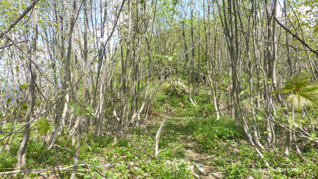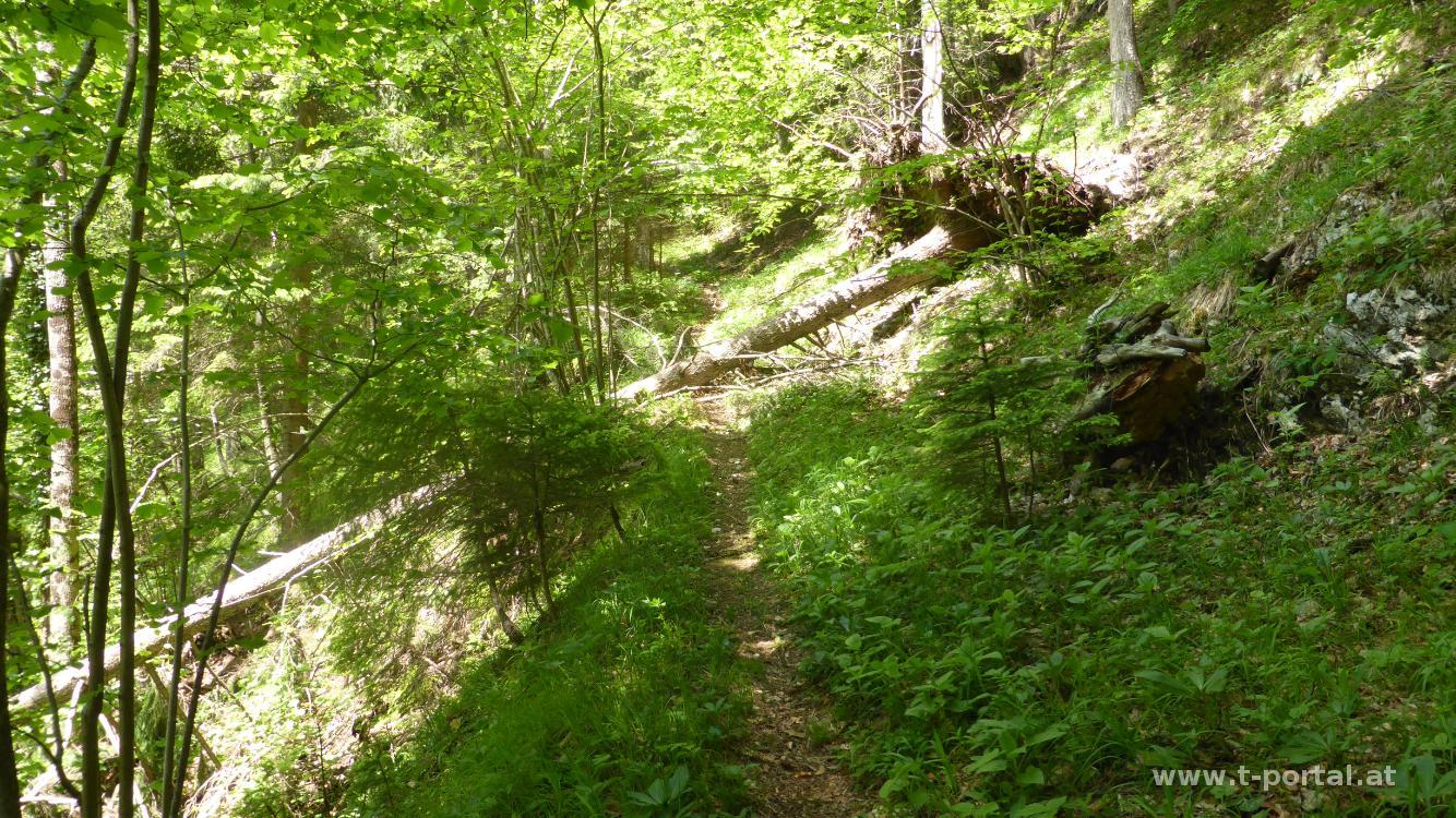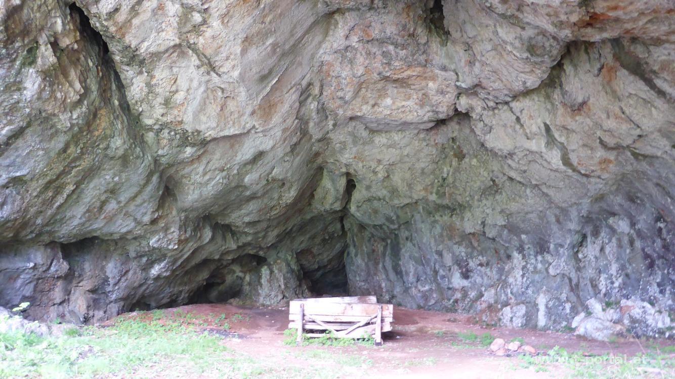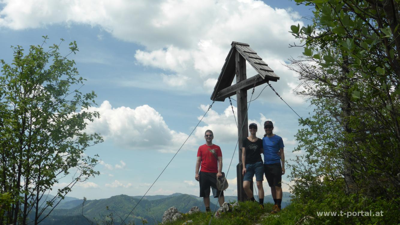 Für die heutige Tour haben wir uns den Falkenstein und den Handlesberg ausgesucht. Mit dabei sind Stefan und Klaudia als Training für unsere sommerliche Wanderwoche. Wir parken beim geschlossenen Gasthof Gruber und wandern von dort ein Stück die Straße entlang und bald nach links hinauf in den Wald. Nun auf schönem Waldweg hinauf bis zu einer Forststraße. Gegenüber dieser geht es gleich noch ein Stück weiter bis zur großen Herrengrotte. Nach Besuch dieser wieder zurück zur Straße, ein Stück weiter und über zwei Leitern zur deutlich kleineren Frauengrotte (anderswo auch Pfeiferloch benannt). Nun folgen wir ein Stück der Forststraße, biegen wieder in den Wald ab und steigen durch diesen weiter auf. Wieder erreichen wir eine Straße, der wir ein Stück folgen und bei einer Linkskurve geradeaus über eine Wiese weiter gehen. Der früher noch mehr ausgeprägte Trampelpfad ist derzeit nicht wirklich zu sehen, also gehen wir durchs nicht so hohe Gras hinab.