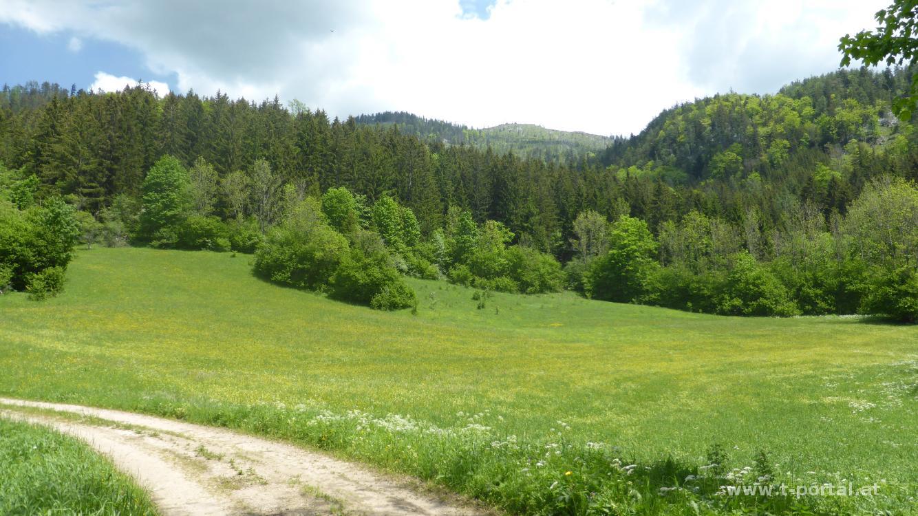 Nach der Wiesenquerung geht es nun längere Zeit auf einer Forststraße bergauf, bis wir den Abzweiger zum Falkenstein erreichen. Es geht nochmal ein Stück bergan und ein paar Minuten später haben wir das erste Ziel erreicht. Wir schauen ein wenig in die Berge und rasten am Bankerl im Schatten. Anschließend zurück zur Straße und auf dieser ein gutes Stück dahin. Es geht mal etwas rauf und wieder runter, bis wir wieder nach links in den Wald abbiegen können und auf einem schmaleren Pfad dem Anstieg folgen. Auch dieser führt uns zu einer Straße und bald zu einem Zaun, den man übersteigen kann (oder einfach durch das offene Zaunfeld gehen). Nun beginnt der steile Anstieg Richtung Gipfel. In ein paar leichten Kurven geht es über Gras und Schotter bergauf. In der Sonne ist uns gut warm und wir freuen uns, als es wieder flacher wird.