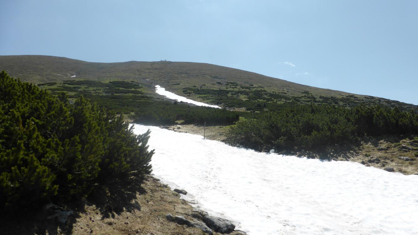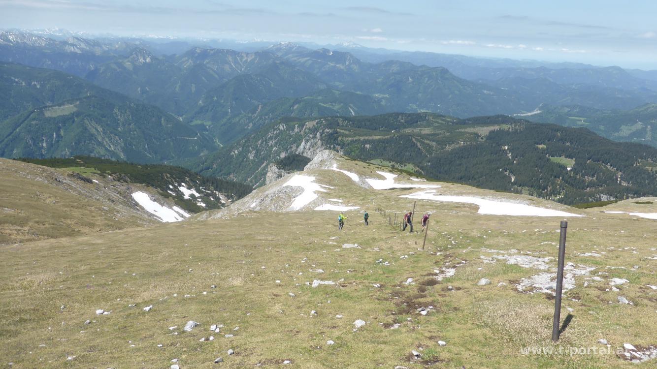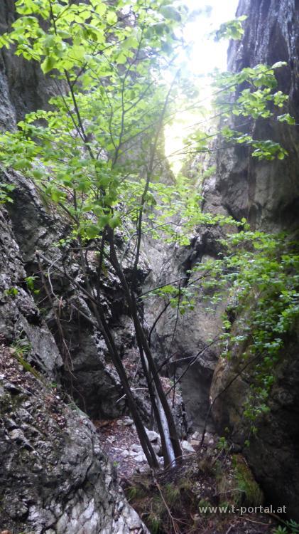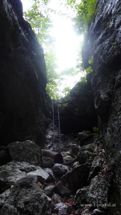 Für die heutige Tour hab ich mir den Schneeberg ausgesucht und nehme den schon bekannten Anstieg durch die Weichtalklamm. Vom Weichtalhaus geht es nach Norden in die Schlucht, neben Felsen und durch Wald hinauf, bis das Gestein immer näher rückt. Nun folgt der schöne Anstieg durch die Klamm, die (wie erwartet) noch etwas feuchter ist, als die letzten Jahre. Drei Leitern und zahlreiche Eisenketten werden zur Überwindung von Steilstufen zur Hilfe genommen. Zwischendurch wird es wieder breiter, bevor die Wände wieder näher rücken.