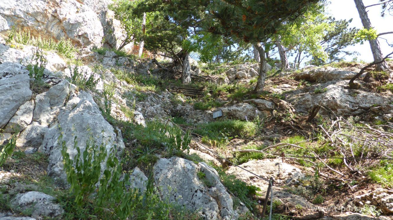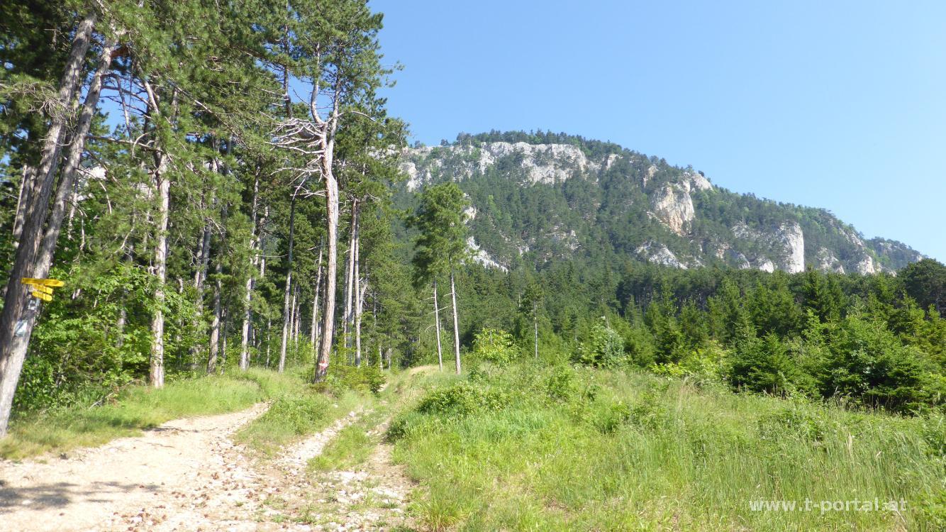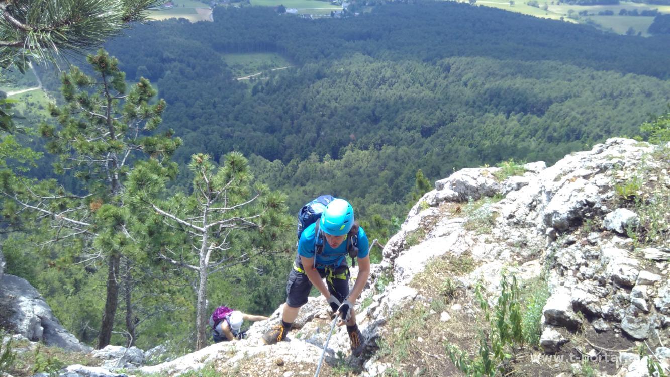 Die Wetterprognosen für das Wochenende sind nicht gerade berauschend und heute haben wir auch nur bis zum frühen Nachmittag Zeit. Wir entschließen uns für eine Tour auf die Hohe Wand mit Klettersteigeinlage. Mit dabei ist auch Klaudias Freundin Yogi. Wir starten in Oberhöflein und gehen von dort am Springlessteig weiter. Durch den Wald geht es zum Wandfuß, wo der Pfad immer steiler wird. In zahlreichen Kehren steigen wir durch die Felsen immer höher. Im letzten Teil gibt es eine Leiter und ein paar seilversicherte Stellen. Der Ausstieg ist direkt beim Hubertushaus. Wir schauen einmal kurz durch die Gegend und machen uns dann auf den Weg zum Einstieg der Steirerspur. Hierzu geht es vom Ende des Springlessteig nach rechts, vorbei am Ende der Steirerspur und nach ein paar Minuten stehen wir schon beim Einstiegsstahlseil.
