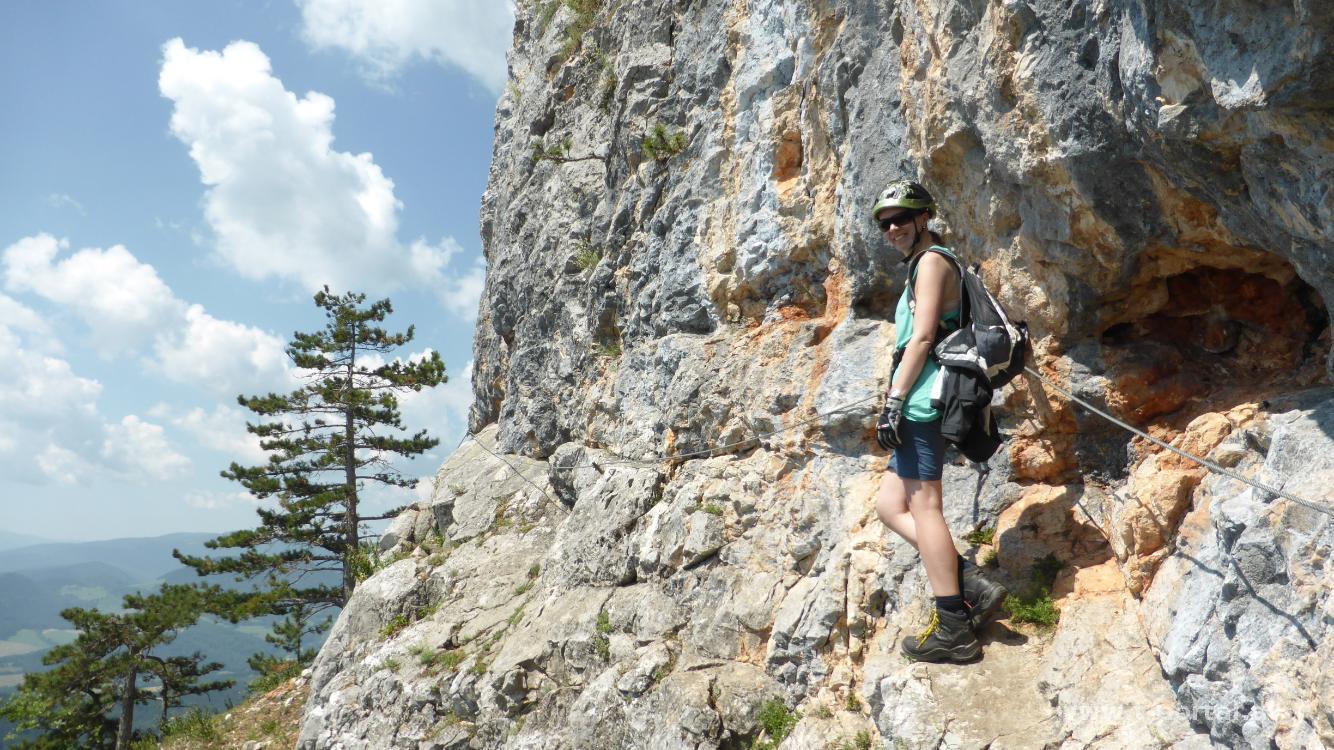 Wir ziehen unsere Klettersteigsets an und machen uns auf den Weg. Das erste Stück geht es in diesem Fall hinab und dann meist quer durch die Wand. Einmal um ein Eck und über eine schräge Platte. Vor lauter blödeln verpassen wir die Abzweigung zum Umhängen und gehen geradeaus weiter. Diese führt uns zum Ende des Springlessteigs. Wir wollten aber eigentlich den direkten und anspruchsvollen teilen der Route nehmen, also gehen wir nochmal zurück, finden auch die Stelle zum umhängen und kraxeln den plattigen Teil hinauf. Auch das schaffen wir recht gut.
