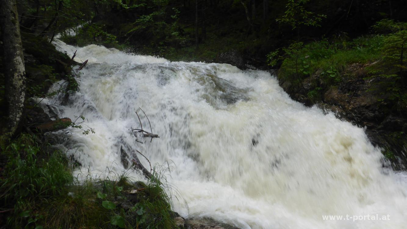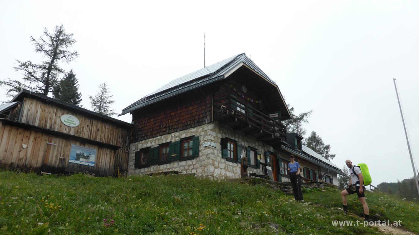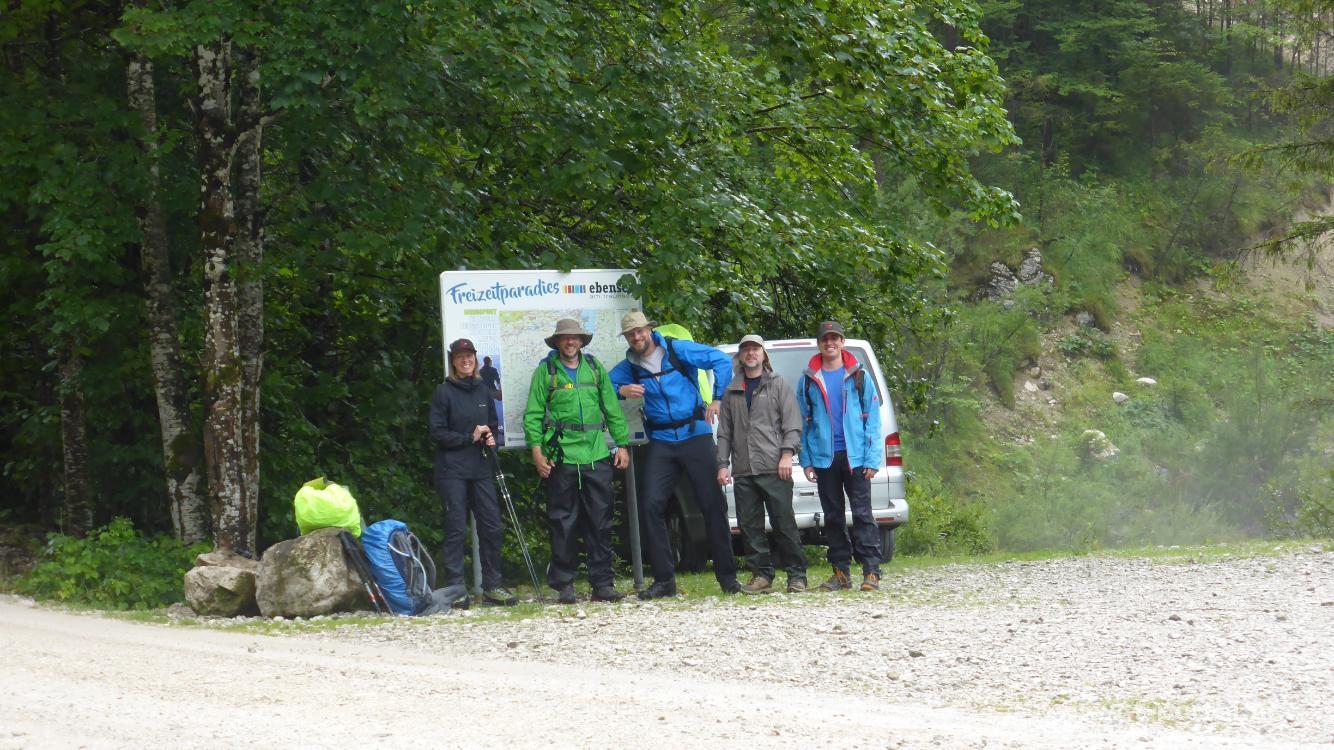 Auch dieses Jahr haben wir eine mehrtätige Wandertour geplant und wandern dabei durchs Tote Gebirge. Mit dabei sind, wie schon letztes Jahr, Klaus, Stefan, Georg, Klaudia und ich. Der erste Tag führt uns von Schwarzenbach bei Ebensee aufs Ebenseer Hochkogelhaus. Als Gipeloptionen wäre noch eine Überschreitung des Schönbergs möglich. Nach Anreise am Sonntag ist jedoch bald klar, dass wir froh sein können, wenn wir trocken bis zur Hütte kommen, denn es regnet am Abend und auch in der Früh. Wir lassen uns also Zeit mit dem Frühstück und machen noch einen Zwischenstopp in Gmunden, bevor wir am Nachmittag nach Ebensee und weiter Richtung Offensee fahren. Nach etwa drei Kilometern biegen wir nach rechts ab und holpern auf der Forststraße entlang des Schwarzenbachs bis zum Parkplatz. Wir haben Glück und inzwischen hat hier der Regen wirklich aufgehört. So packen wir unsere sieben Sachen und machen uns auf den Weg. Auf der Forststraße geht es neben dem tosenden Bach gleich aufwärts, bald nach links und flacher bis zum ersten Abzweiger weiter. Nun wählen wir den Wald-, anstelle des Forstwegs, für den weiteren Anstieg. Über feuchtes Laub und Steine geht es aufwärts, dann etwas flacher dahin und leicht hinab zurück zur Forststraße. Auf dieser erreichen wir bald das (heute geschlossene) Mittereckerstüberl.