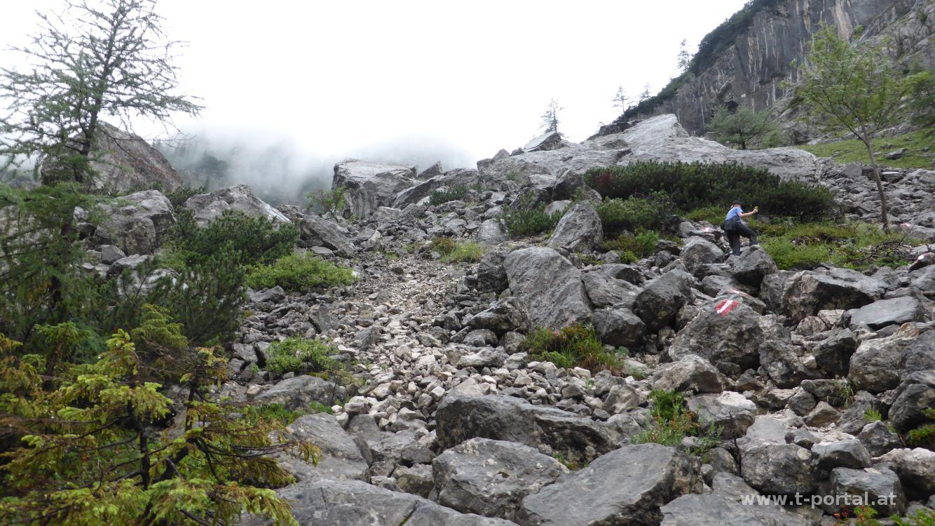 Hier startet auch die Materialseilbahn zum Ebenseer Hochkogelhaus und um (aktuell) vier Euro kann man bei vorheriger Anmeldung seinen Rucksack zur Hütte transportieren lassen (fährt zweimal am Tag). Zwei Leute wollen sich nicht vom Rucksack trennen, der Rest platziert das Gepäck im Materialkorb. Nun geht es noch ein Stück auf der Forststraße weiter, dann biegen wir nach rechts auf einen schmalen Pfad ab, der uns bald steiler hinauf führt. In zahlreichen Kehren geht es nun am steinigen Pfad durch Wald und später durch Geröll und Felsblöcke hinauf. Unterwegs rückt der Nebel näher und es nieselt kurz. Am Wiesenhang rechts von uns sehen wir eine einzelne Gams, nach einer gesicherten Passage entlang einer Wand sehen wir gegenüber dann ein ganzes Rudel mit mehr als zwanzig Tieren.