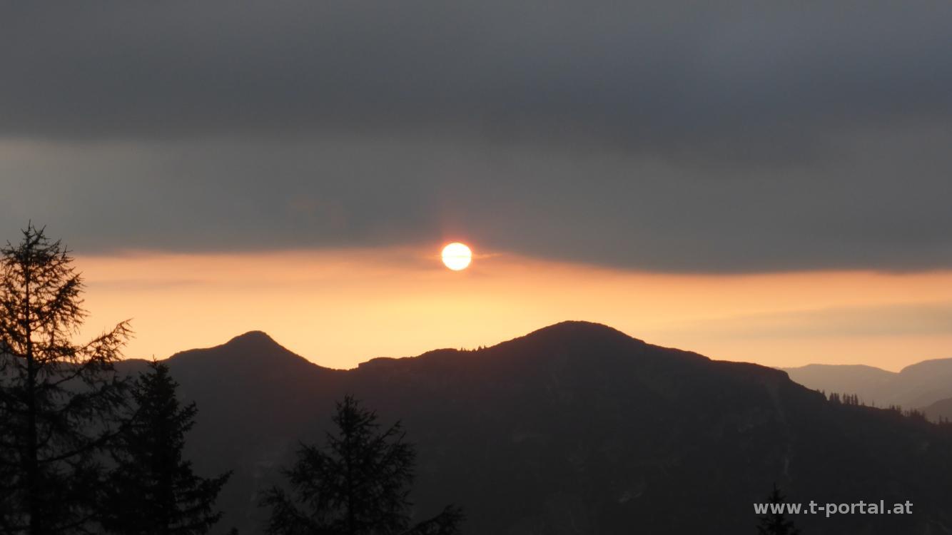 Nach dem nächsten gestuften Anstieg informiert uns ein nettes Hinweisschild, dass wir es bald geschafft haben. Und wirklich, wenig später taucht auch das Hochkogelhaus hinter den Bäumen auf. Bald sitzen wir in der Hütte beim ersten Hüttenradler. Abends wir es noch etwas freundlicher und unter den Wolken kommt Richtung Feuerkogel die Sonne kurz hervor, bevor sie hinter den Bergen wieder verschwindet.