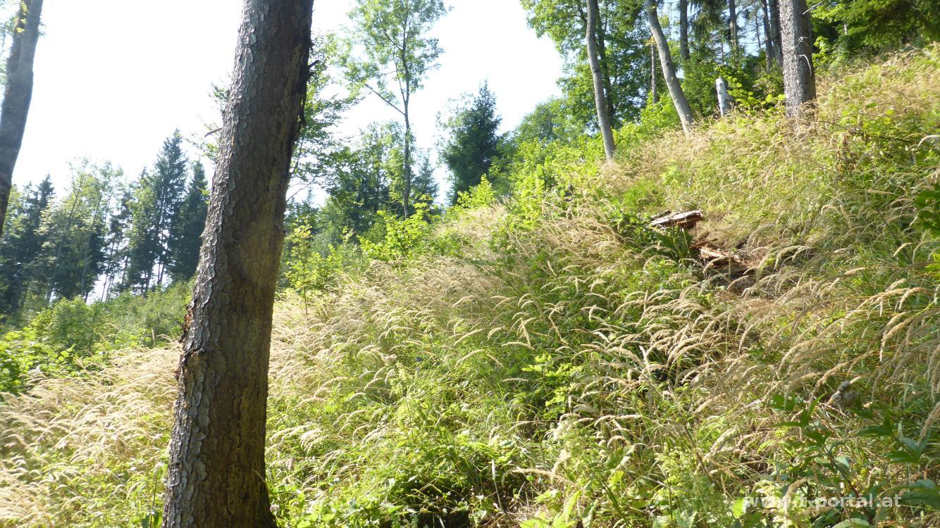 Klaus glaubte, dass er noch nie am Obersberg war. Stefan, Klaudia und ich stehen ihm zur Seite und beseitigen dieses Manko. Wir starten (wie üblich) in Schwarzau bei der Kirche und wandern über die Wiese zum Pfarrhügel. Nun geht es im Wald bald durch hohes Gras aufwärts. Ich selbst war ja bisher nur im Winter am Obersberg, mit diesem ganzem Geblüh ist das ganz ungewöhnlich. Weiter oben sperrt ein umgestürzter Baum den Weg ab, darum wenden wir uns nach rechts und folgen dem ausgetreten Umleitungspfad im Hang direkt hinauf auf die Forststraße. Auf dieser kurz nach vor und nach links in den nächsten Waldhang. Im Wald ist es gemütlich zum gehen, bevor wir etwas schräg den Hang durchs Gemüse queren.