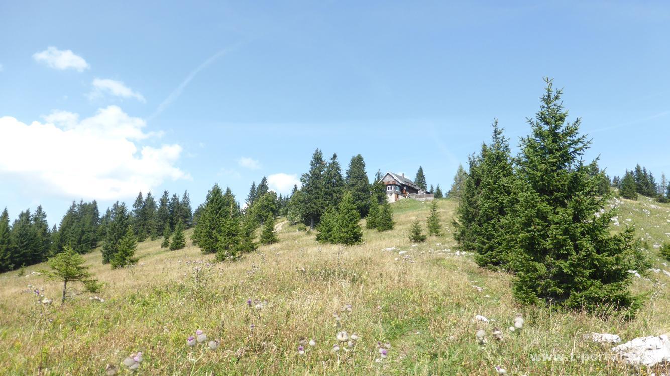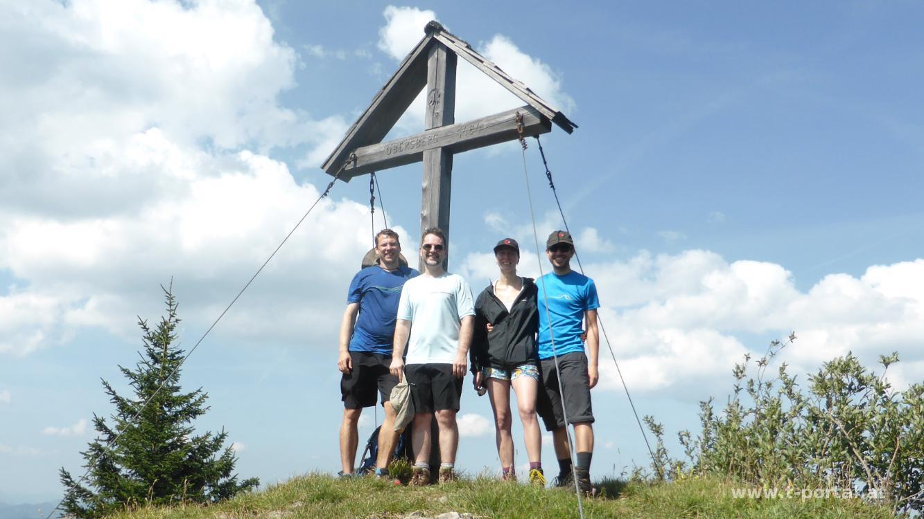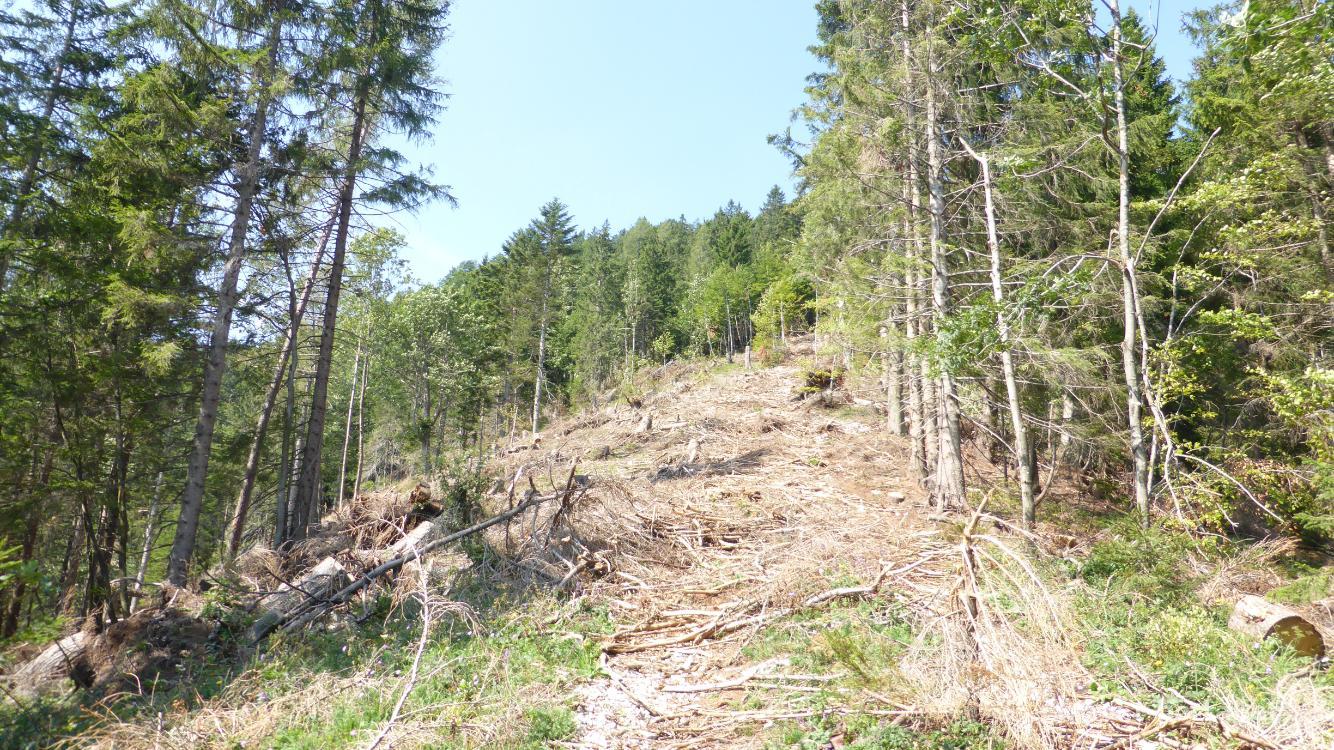 Weiter geht's mal mehr, mal weniger aufwärts. Zwischendurch kommt etwas Wind auf und es ist nicht mehr ganz so heiß. Wir queren ein paar mal die Forststraße, treffen doch noch ein paar andere Wandermenschen und stellen fest, dass vor dem steileren Anstieg wohl ziemlich der Wind gewütet hat und hier einiges an Holz herumliegt. Auch dieses können wir umrunden und erreichen nach dem nächsten Anstieg und ein paar Kurven die Wiese unter der Waldfreundehütte. Wir wandern weiter zur Hütte, einmal rundherum und stehen wenig später beim Gipfelkreuz. Nach Rundumblick und Foto machen wir uns auf den Rückweg zur Hütte.