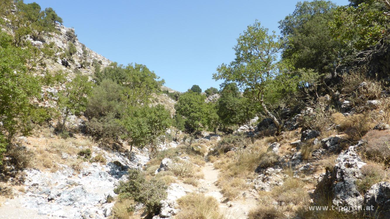 Kälter wird uns auch unterwegs nicht, da es trotz Schlucht nicht so viel Schatten gibt. Zwischendurch haben wir Ausblick zurück zum Kastello von Frangokastello. Nach gutem Wasserverbrauch erreichen wir die Straße, der wir noch etwa 20 Minuten bis zu einem kleinen Cafe am Kalikratis Plateau folgen.