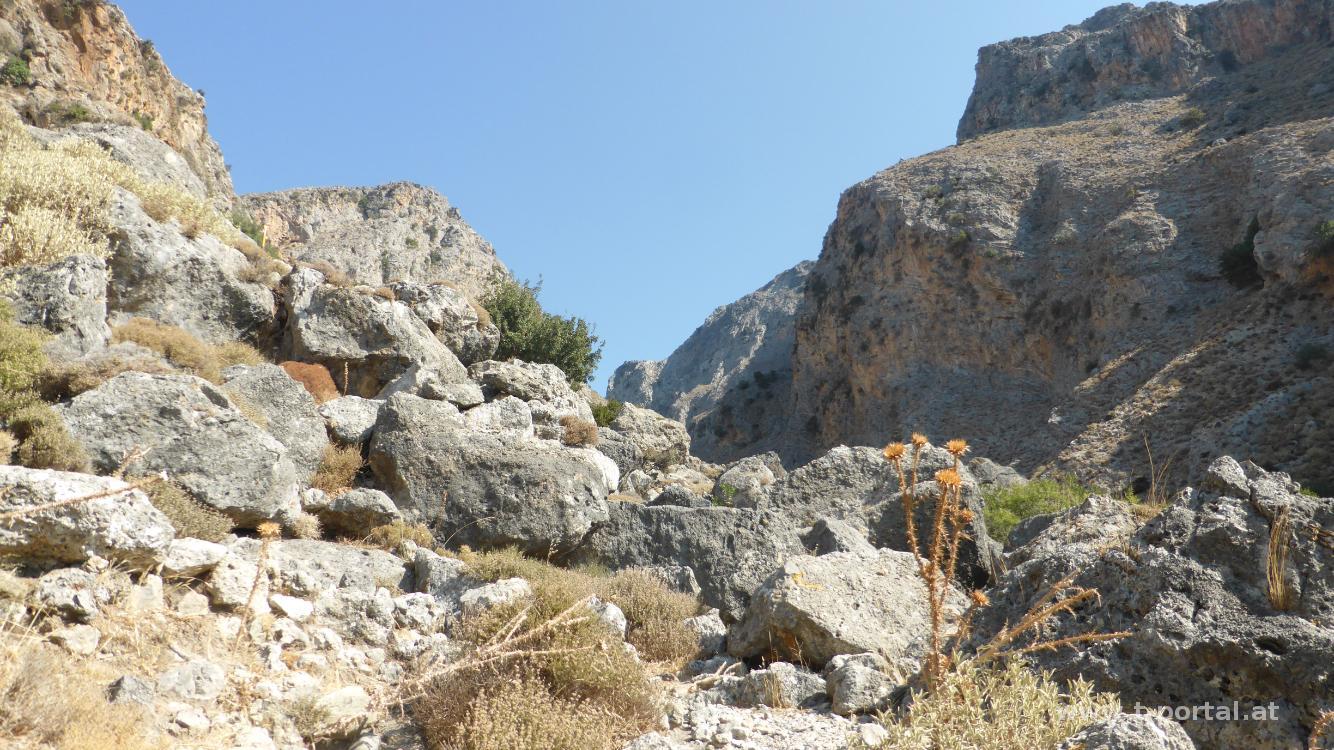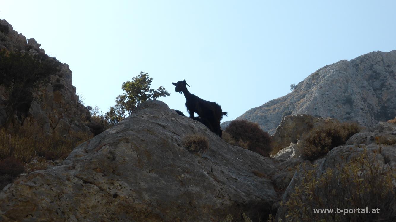 Wir verbringen noch eine Woche im sonnigen Kreta und wandern heute durch die Kalikratis Schlucht. Bereits am Vormittag ist es gut warm und wir parken unsere Rennschüssel ein Stück nach Kapsodasos auf der Straße Richtung Kalikratis. Von dort geht es auch gleich auf den E4 Wanderweg, der durch die Schlucht führt. Über Steine und Sand geht es immer aufwärts. Mal ist die Schlucht größer, mal nur ein paar Meter breit. Unterwegs treffen wir viel Bergtee und einige Ziegen, die hier echt überall herumklettern.