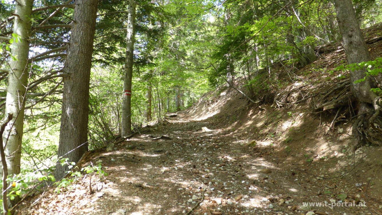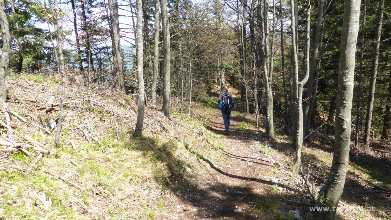 Wir rasten im Windschatten und wandern anschließend am schönen Wanderweg neben dem Kamm der dürren Wand dahin. Nach etwa 15 Minuten weißt uns ein Schild auf die Tablerhöhle hin, die wir noch besuchen. Der Weg dorthin ist etwas schräg und nass. Wir wagen uns ein Stück in die Höhle hinein, für mehr Erkundungen fehlen uns aber die Lampen. Anschließend zurück auf den Normalweg und weiter am Kamm entlang, bis wir nach rechts abbiegen und wieder zurück zu unserem Aufstiegsweg gehen. Auf diesem finden wir dann doch noch einen Abschneider und gehen ein Stück durch Wald und über eine Eselsweide retour. Anschließend besuchen wir noch die Balbersteine.