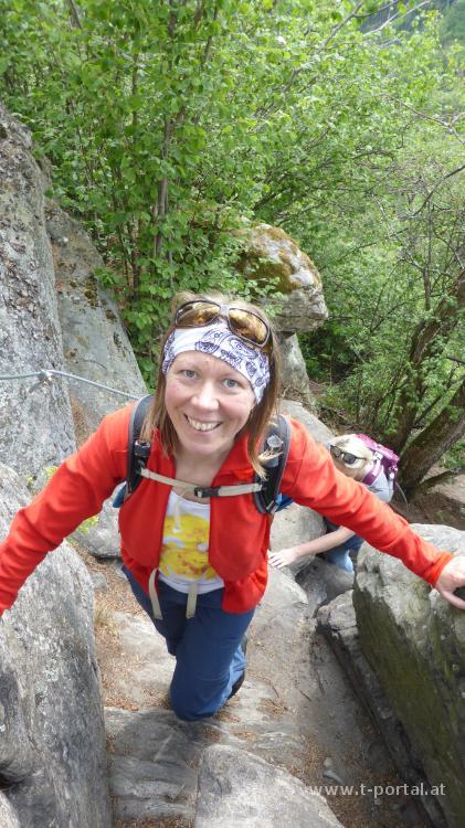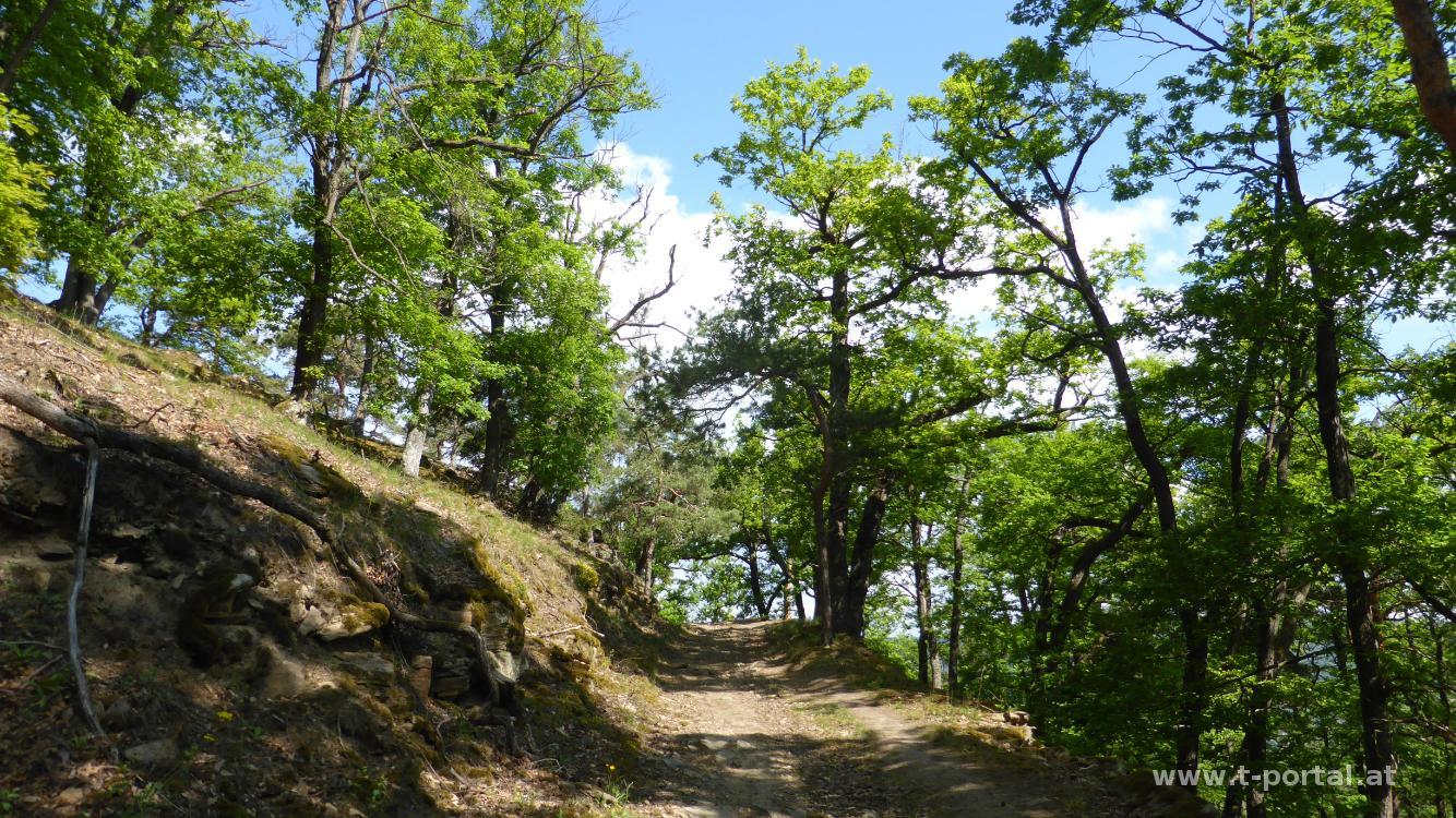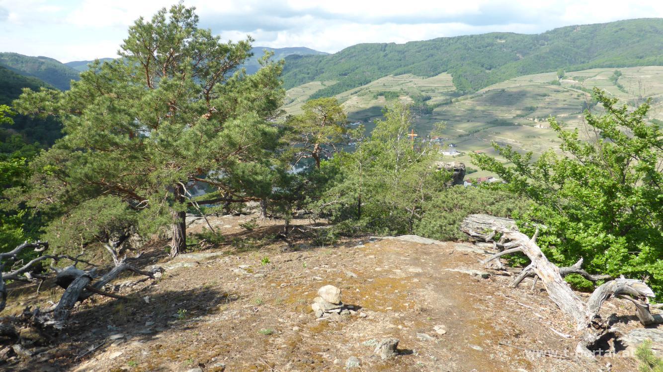 Für heute haben wir uns eine Runde in der Wachau ausgesucht. Mit dabei ist auch Klaudis Freundin Yogi. Wir starten unsere Tour bei der Wachauer Nase in St. Lorenz. Von dort geht es einmal über die Bundesstraße und durch den Wald gleich mal hinauf bis zu einem Aussichts- und Gendenkplatz. Nun im Wald flacher dahin bis zu einer Forststraße. Dieser folgen wir nun um Kurven und Kehren immer leicht ansteigend weiter neben Felsen und Bäumen dahin. Die Straße wird zu einem Pfad und nach den nächsten paar Felsformationen biegen wir nach rechts hinab zum Falkenhorst.