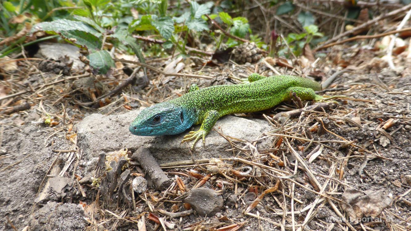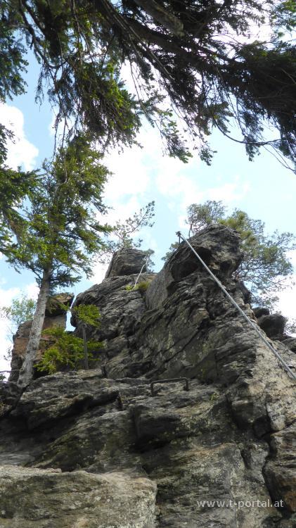Hier genießen wir kurz den Blick zur Donau und gehen anschließend zurück zum Welterebesteig. Nach etwas auf und ab geht es bald mehr bergan zu einer kleinen Scharte. Hier treffen wir auf die ersten von heute zahlreichen Smaragdeideschen (so viele habe ich noch nie bei einer Tour gesehen). Nach dem nächsten eher flachen Stück biegen wir zur Hirschwand ab und besteigen diese über den kurzen Klettersteig. Heute ist es recht windig, darum geht es auch gleich wieder runter. Über gemütliche Pfade erreichen wir wenig später den Seekopf. Die Warte wurde wegen Einsturzgefahr abgebaut und soll durch eine neue Konstruktion ersetzt werden.