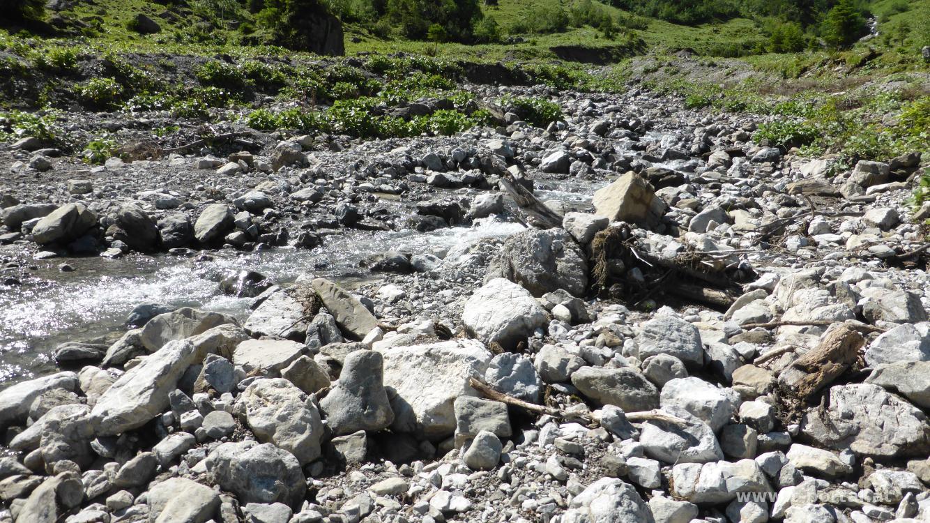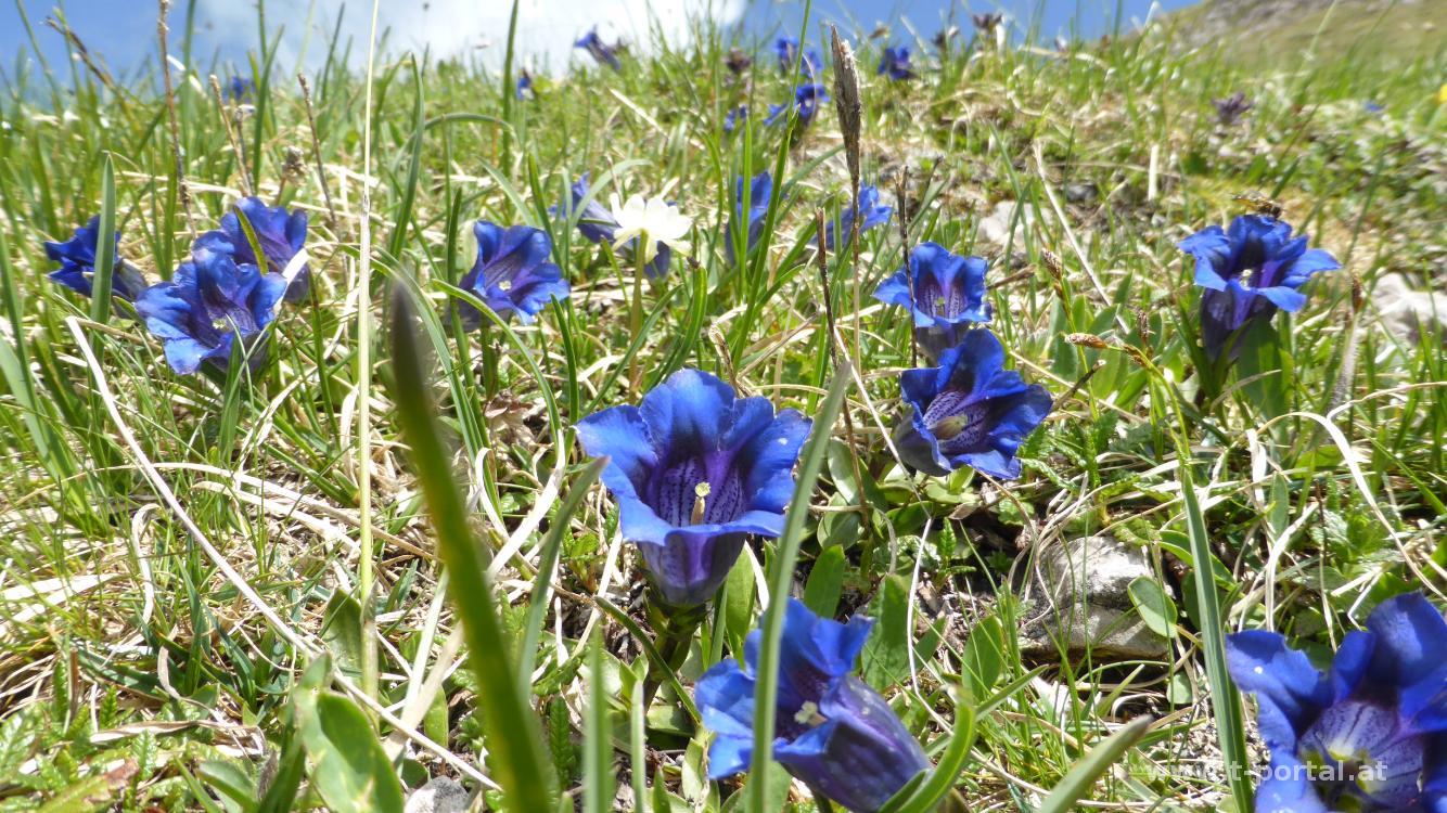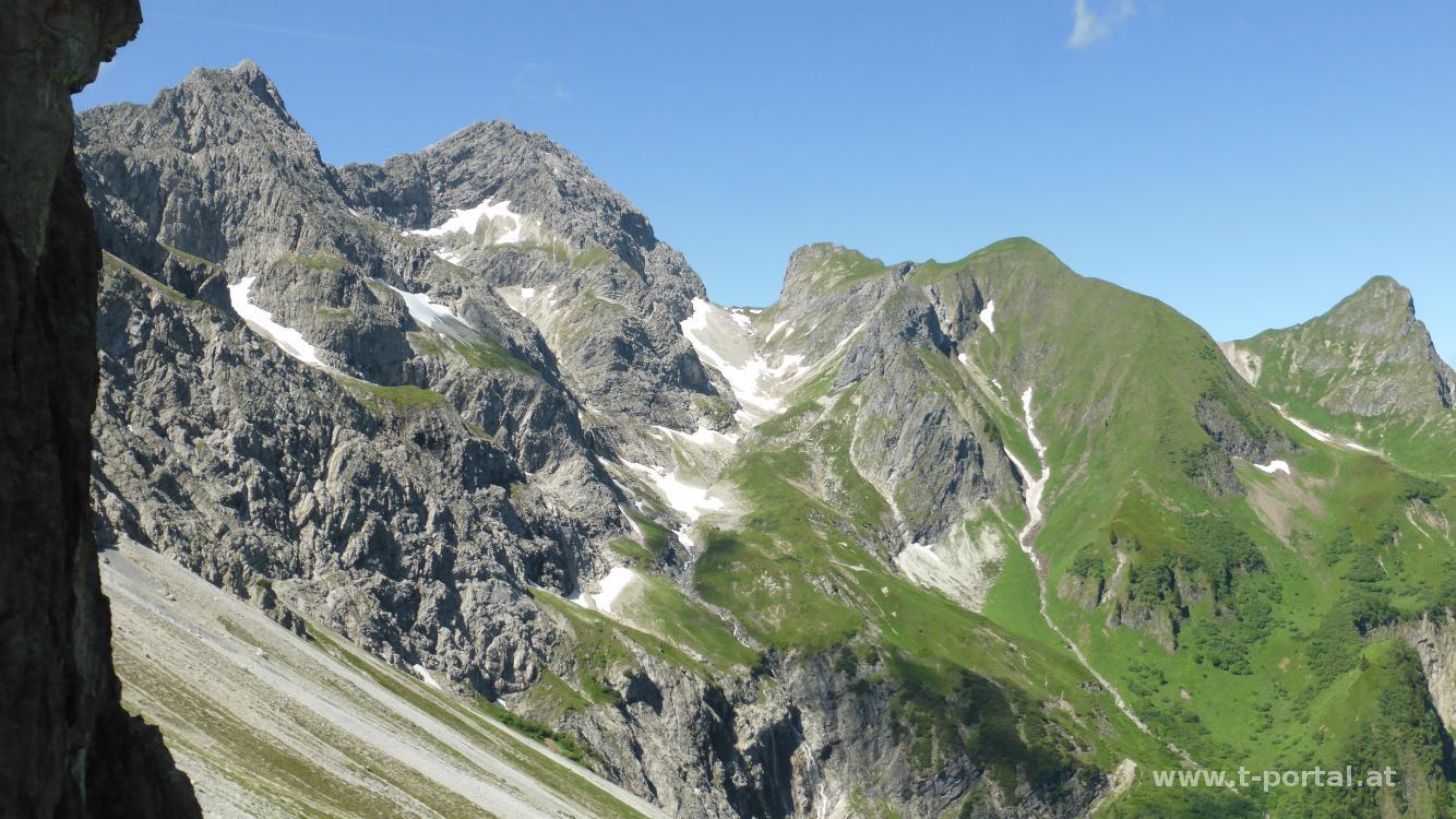 Nachdem es gestern geregnet hat, machen wir uns heute wieder auf zu einer Wanderung. Auf der Forststraße geht es hinauf zur Annalperaualpe. Hier wenden wir uns nach links auf den Wanderweg und wandern über Kuhweiden und einen Bach. Über einen Schotterweg geht es weiter aufwärts. Unterwegs haben wir immer wieder schöne Ausblicke zu den Wasserfällen, die die noch zahlreich vorhandenen Schneefelder entwässern. Wir passieren den am Abzweiger zum Zitterklapfen und erreichen etwas später die Töbelealpe. Von hier sieht man links schon das Töbele Joch.