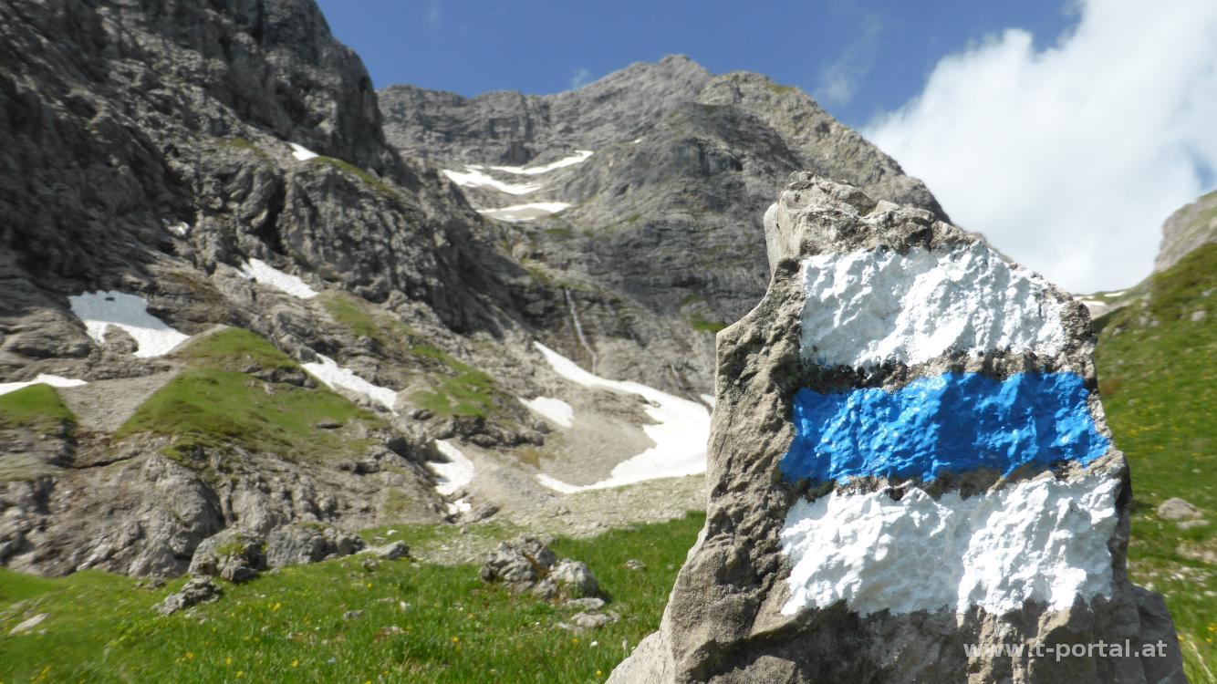 Seit Tagen schauen wir unserer Hütte schon zum Zitterklapfen, dem höchsten Berg in unserer Umgebung (2403m). Auf diesen führt ein anspruchsvoller Weg mit Steigpassage und 2er Kletterei. Am Anfang der Woche störten noch zwei Schneefelder den Weg, inzwischen war eines abgewaschen und mit gutem Zoom war auch die Route durchs Schotterfeld zu erkennen. Das obere Schneefeld sah aber unpassierbar aus. Somit machen wir uns heute nur auf bis zu den Wasserfällen, die diese Schneefelder entwässern. Auf der gleichen Route wie am Vortag geht es zur Annalperaualpe und weiter hinauf bis zum Abzweiger ein Stück vor der Töbele Alpe. Von hier geht es quer hinüber bis zum Wasserfall und zur Bachquerung. Anschließend zwischen Felsmauer und Abgrund steil hinauf, bis wir wieder Wiesengrund erreichen.