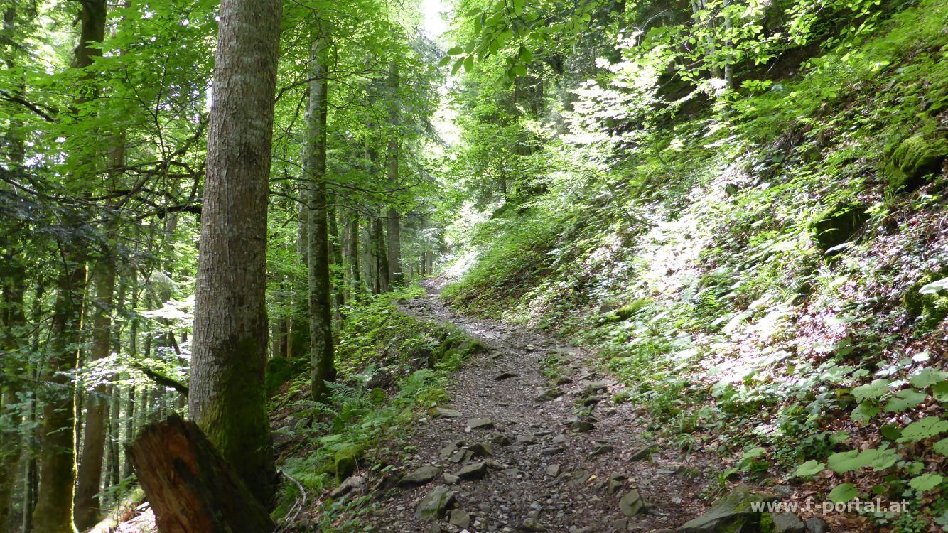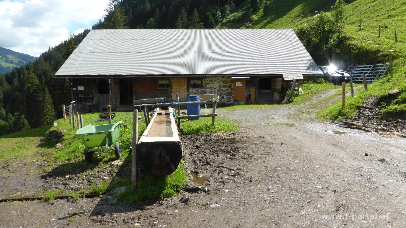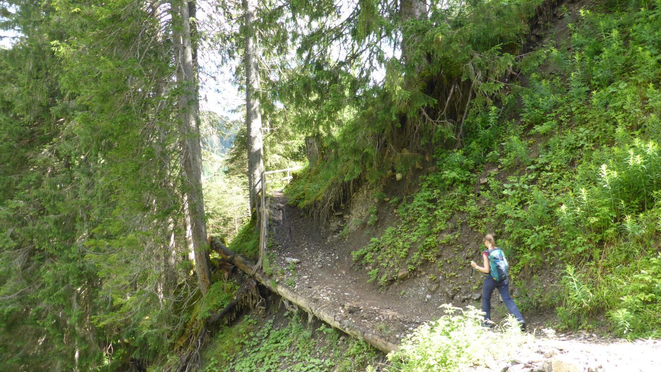 Das Wetter ist eher schlecht angesagt, am Vormittag schaut's dann aber doch nicht so schlecht aus. Darum entschließen wir uns von der Alm hinab nach Schoppernau zu gehen, um etwas einzukaufen und Essen zu gehen. Bevor es hinab geht, geht es aber nochmal hinauf: Wir wander nämlich zuerst zur Tobelalpe, dann über etwas anspruchsvolleren Weg durch den Hang und durch Gras hinauf, bevor es hinab auf eine Forststraße geht. Dieser folgen wir ein gutes Stück, bis wir den Abzweiger Richtung Au finden. Der Weg nach Schoppernau ist nämlich die Forststraße.