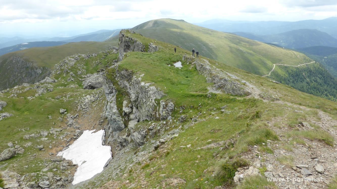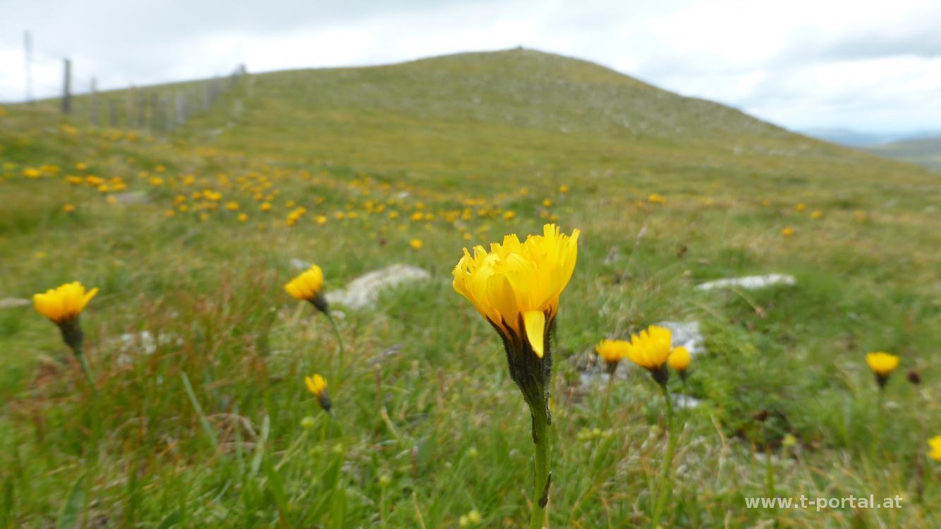 Über die Almwiesen geht es nun weiter aufwärts, wobei sich die Kühe auf der anderen Seite des Zauns verstecken. Wir erreichen den kleinen Speikkofel, gehen ein paar Meter hinab zur nächsten Wegkreuzung und dann nochmal hinauf, bis wir den großen Speikkofel erreicht haben. Kreuz gibt es keines, nur einen Metallsteher. Nachdem wir noch nicht genug haben, entschließen wir uns noch weiter zur Bretthöhe zu gehen. Vom Speikkofel geht es etwas hinab über den "Torer" mit Ausblick zu den Gurkursprungseen und anschließend hinauf zur Bretthöhe.