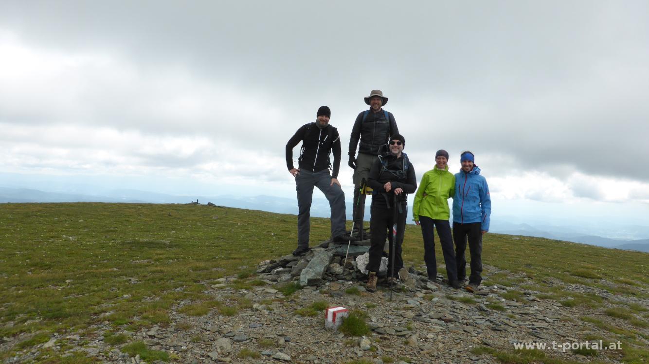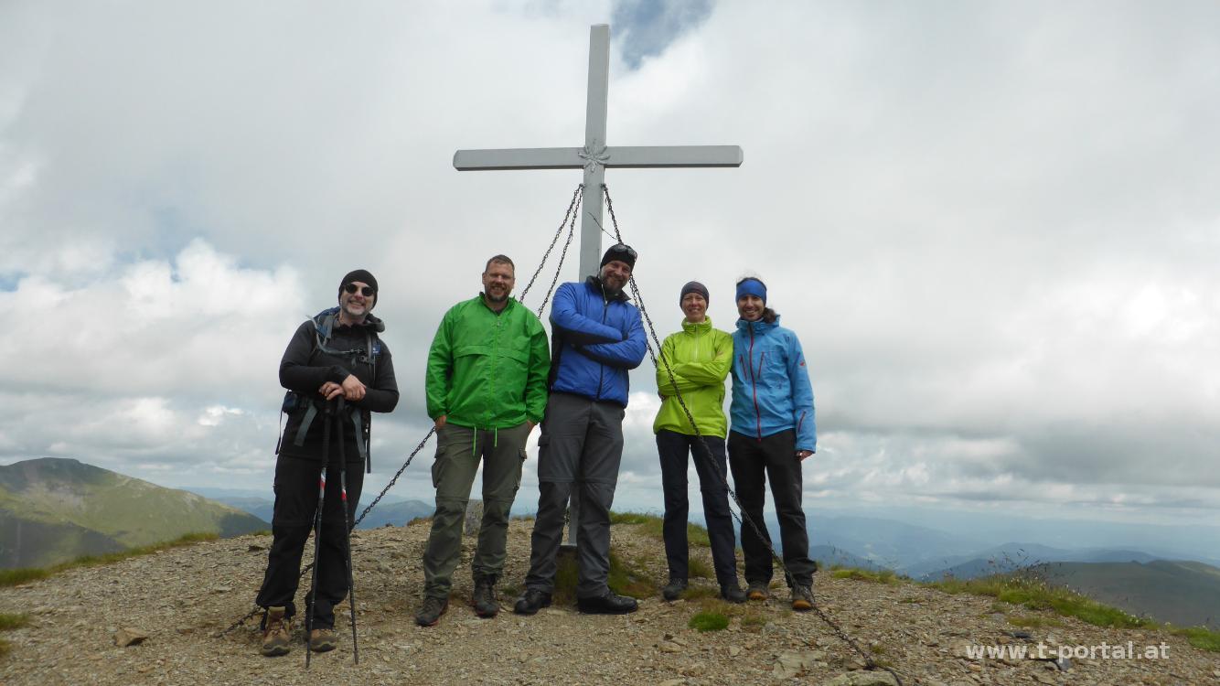 Beim Gipfelkreuz wird es etwas schöner und somit legen wir hier unsere Jausenpause ein. Anschließend wandern wir ein Stück Richtung Turracher Höhe, biegen aber bald wieder nach Süden ab und steigen ab zum eckigen Zgartensee. Auf einem Almweg weichen wir ein paar Kühen aus, kürzen den Weg durch einen Graben ab und kommen so hinab zur Zgarten Alm. Auf der Straße geht es nun etwas hinauf und anschließend mehr oder weniger gerade hinüber zur Speikkofelhütte. Der weitere Weg führt uns über die Almwiesen zurück zum Lorenzer Brunnen und am Aufstiegsweg zurück zum Start.