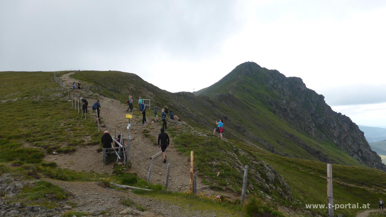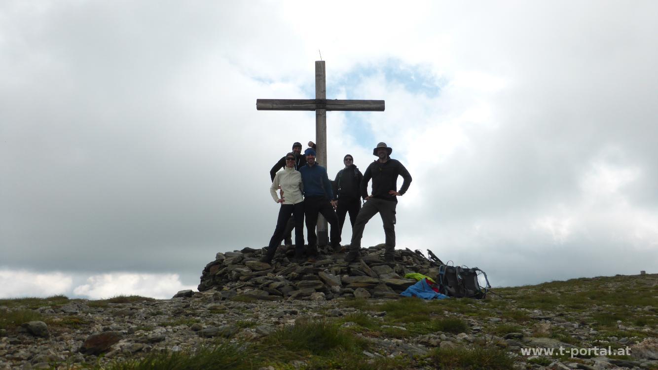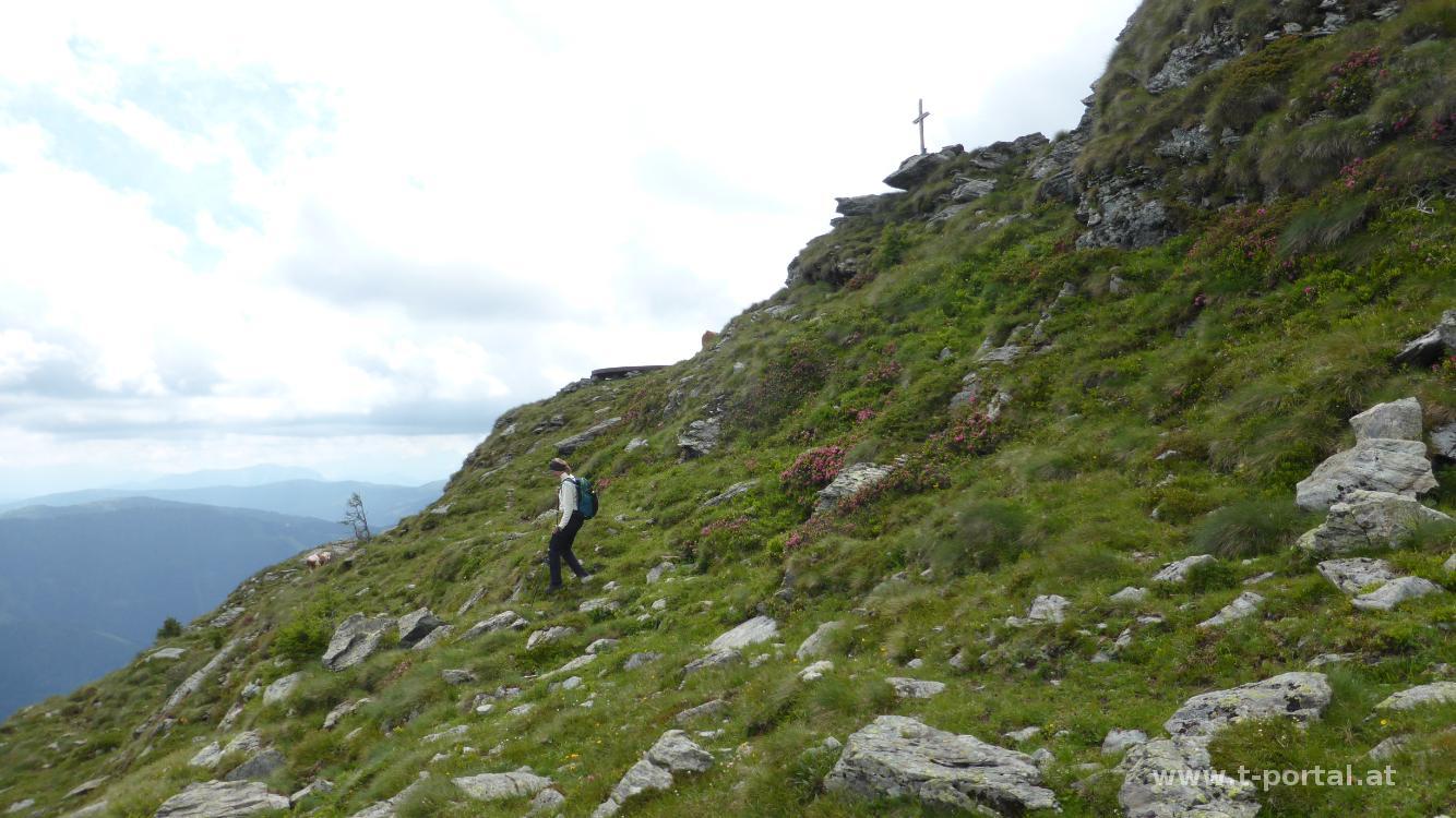 Von der Scharte geht es nochmal hinauf und wenig später stehen wir am Gipfel des Falkert. Auch heute zieht es ziemlich herum, wir pausieren hier trotzdem kurz. Anschließend geht es retour zur Falkertscharte und auf der anderen Seite hinauf auf den zwei Meter höheren Rödresnock. Hier ist deutlich weniger los als am Falkert. Die dunkelsten Wolken haben sich verzogen und wir ziehen bald weiter. Ein Stück geht es am Kamm vorwärts und dann nach rechts hinab. Nach Abstieg erfolgt ein kurzer Gegenanstieg zum Schwarzkofel (kleines Kreuz) und anschließend ein langer Abstieg durch Kühe und Grasland bis zur Moschelitzenalm.