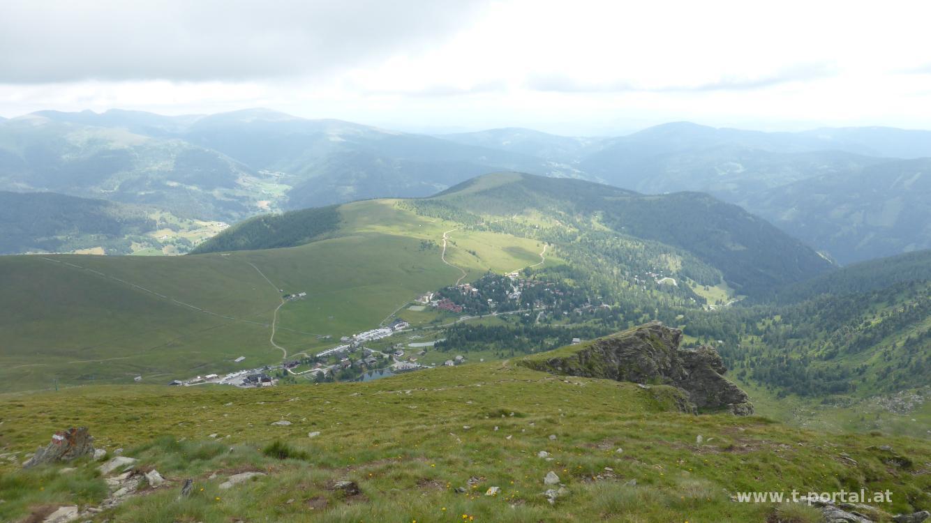 Unsere zweite Kärntentour startet unweit unseres Quartier in Zirkitzen und führt uns zum Falkert und auf den Rödresnock. Wir gehen ein Stück auf der Straße aufwärts, dann ein Stück auf einem Rund-Ums-Dorf-Weg und bald wieder auf der Straße. Ein paar Kurven später erreichen wir den ersten Wegweiser, gehen nach rechts und biegen nach Rückblick ins Dorf scharf nach links ab. Nun geht es auf einer Forststraße weiter aufwärts. Nach der nächsten Kehre verlassen wir diese und steigen am Wanderweg durch den Wald weiter hoch. Es geht durch Wald, über Wiesen und vorbei an Kühen. Weiter oben queren wir zweimal eine neue Forstautobahn und erreichen eine markante Wegkreuzung mit Marterl und Ausblick vom Wöllaner- bis zum Rosennock. Wir wenden uns nach rechts und gehen nun immer gerade aus leicht ansteigend Richtung Rödresnock. Bevor es gerade hinauf zum Gipfel ginge, führt der Weg nach links durch den Grashang hinüber auf die Falkertscharte. Hier treffen wir auf zahlreiche Wanderer, die vom Parkplatz bei der Heidialm (eigentlich ein ganzes Heididorf) kommen.