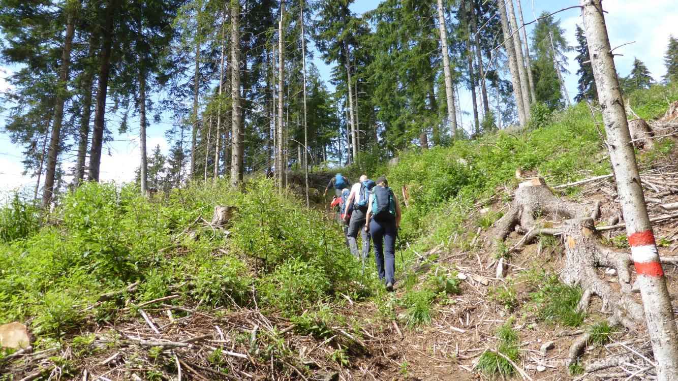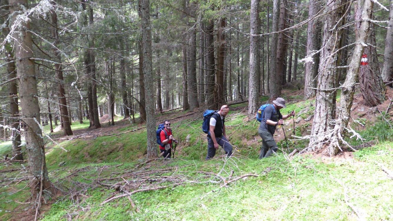 Von hier wählen wir einen unmarkierten Pfad zurück ins Tal. Anfangs finden wir noch Steigspuren, die bei einem Zauneck enden. Diesen überklettern wir und folgen dem Zaun bis an sein Ende. Hier wieder drüber und hinab zu einer Forststraße. Gerade über diese hinüber und auf der anderen Seite auf mehr oder weniger vorhandene Spuren bis zum nächsten Zaun. Auch über diesen und durch Wald im Zick-Zack flott hinab bis zum Ende einer Forststraße. Weiter unten sehen wir bereits die Zielwiese und nach erneutem Abstieg durch den Wald erreichen wir sie auch. Wir rasten hier etwas und gehen dann am Wiesenrand zur Forststraße und auf dieser hinab zum Bauernhof mit Buschenschank. Von dort geht es auf der Asphaltstraße zurück zum Start.