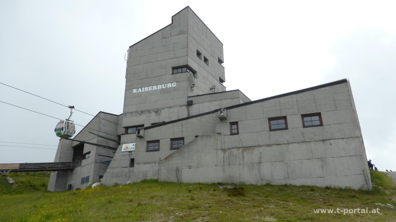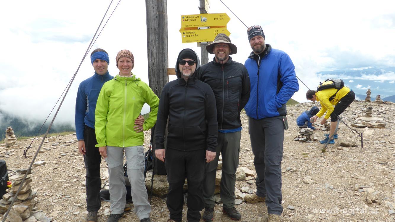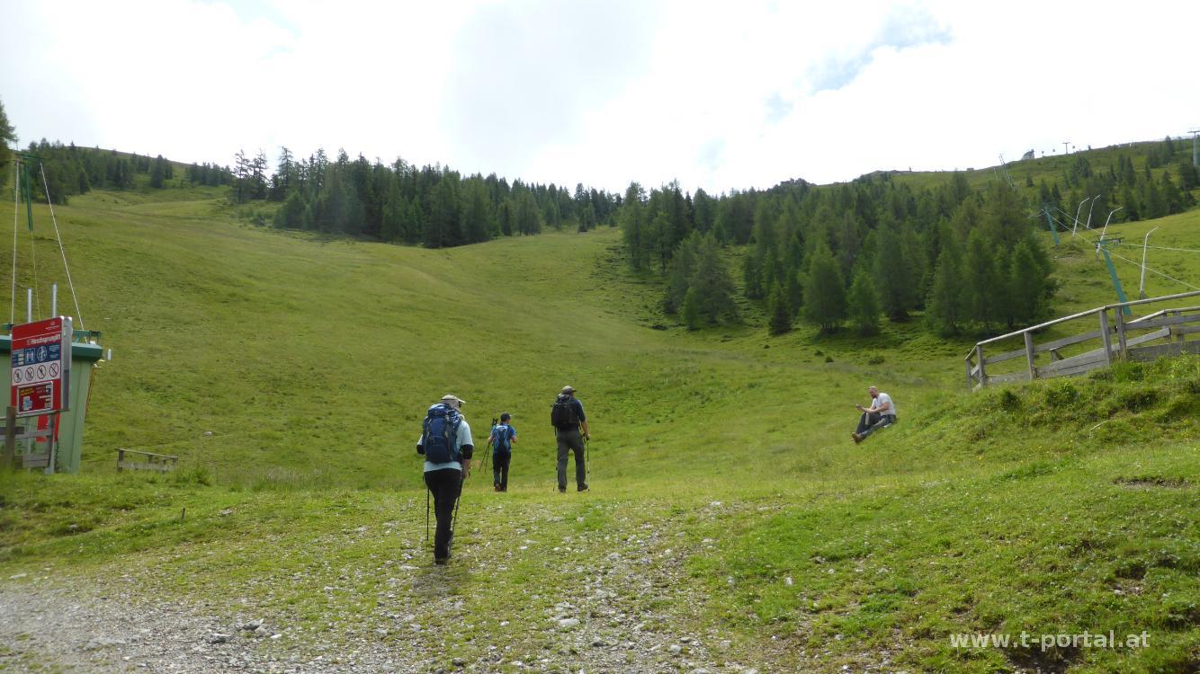 Auch heute schaut das Wetter nicht stabil aus, darum entscheiden wir uns erneut für eine Tour vor der Haustür und machen uns auf zum Wöllaner Nock. Der stand eigentlich weiter hinten auf der Bergwunschliste für diese Woche, führt doch eine Gondel bis fast ganz hinauf. Vom Quartier geht es einmal über die Bundesstraße, zum Sportplatz und von dort auf eine Forststraße. In der zweiten Kehre biegt der gut ausgeschilderte Wanderweg ab und führt über einen Wiesenweg hinauf. Durch Wald geht es zu einer kleinen Alm, über einen Bach, wieder aufwärts bis wir die Lifttrasse queren. Nun folgen wir der Forststraße bis zum nächsten Schlepplift und über die Schipiste weiter aufwärts. Oben angekommen folgen wir wieder der Straße und kommen so zur Kaiserburg (Brutalistische Bergstation der Gondelbahn). Auf einem breiten Schotterweg geht es nun weiter zum Gipfel des Wöllaner Nock.