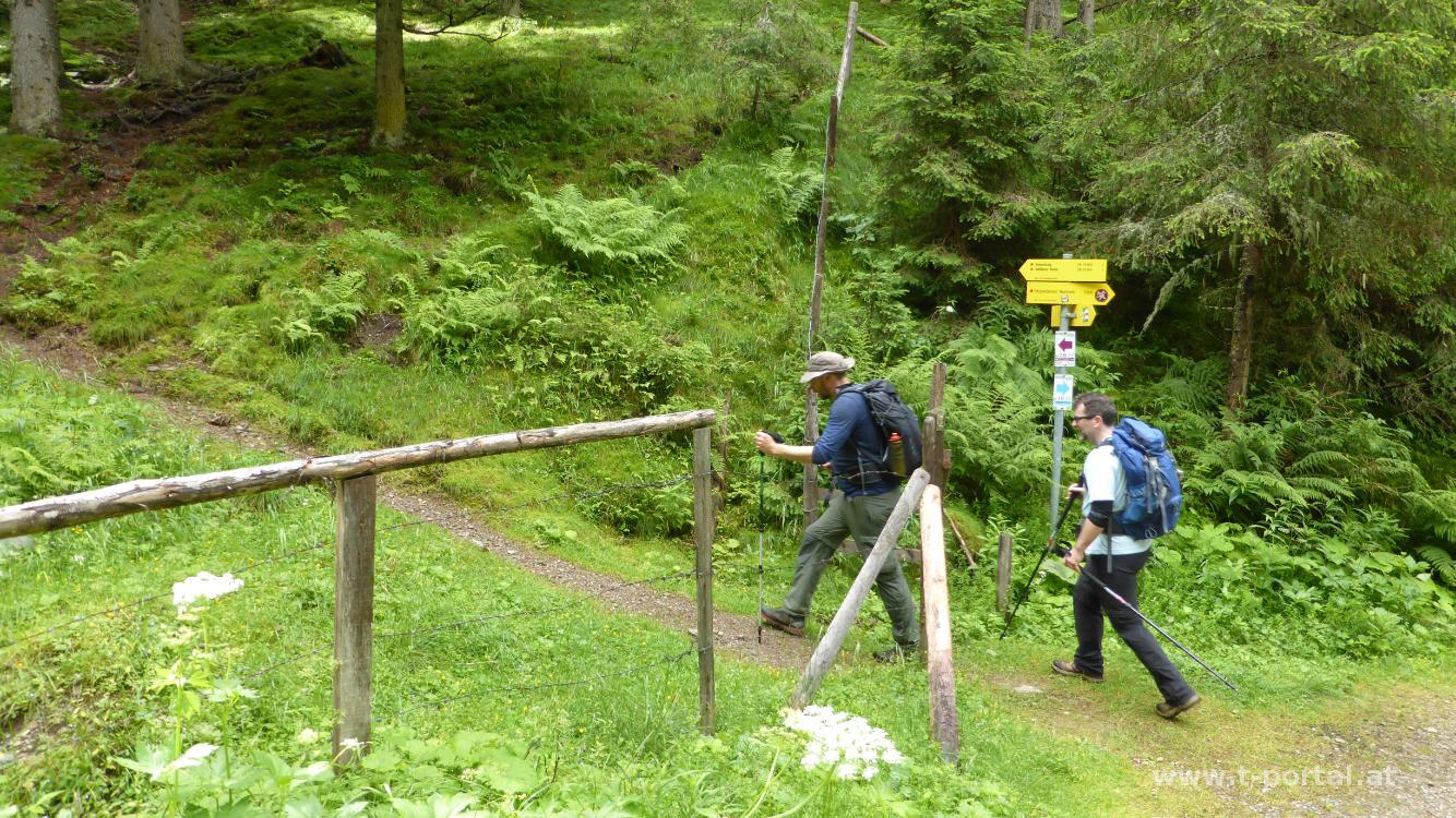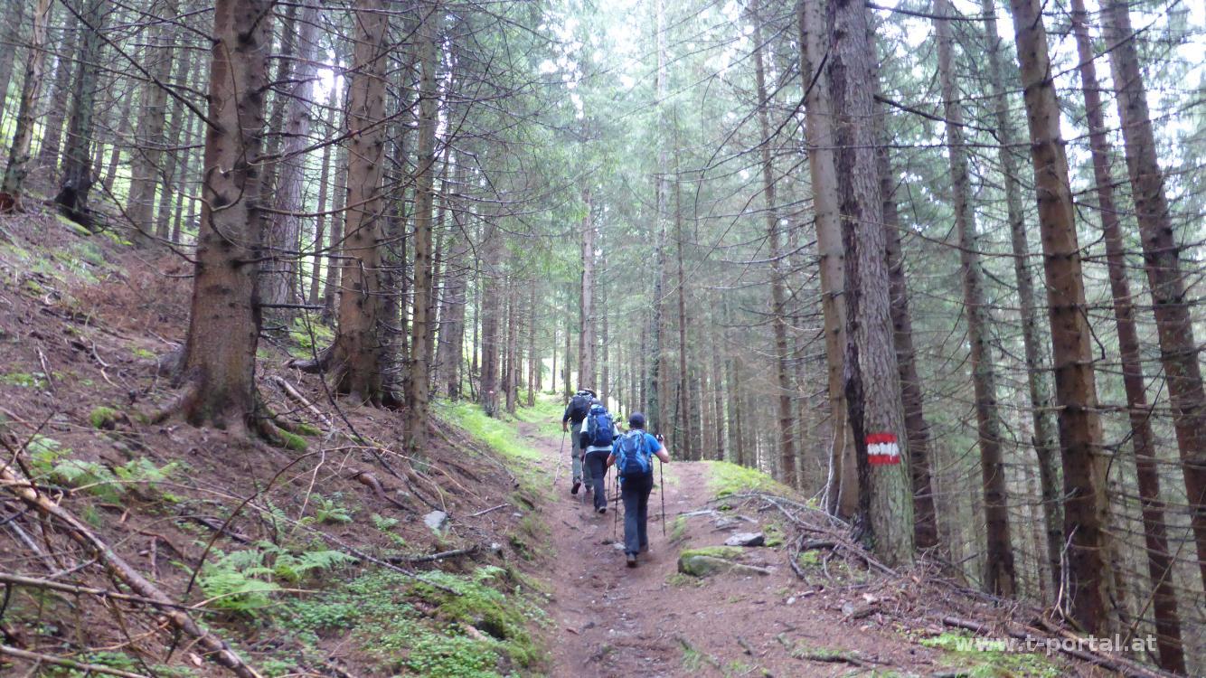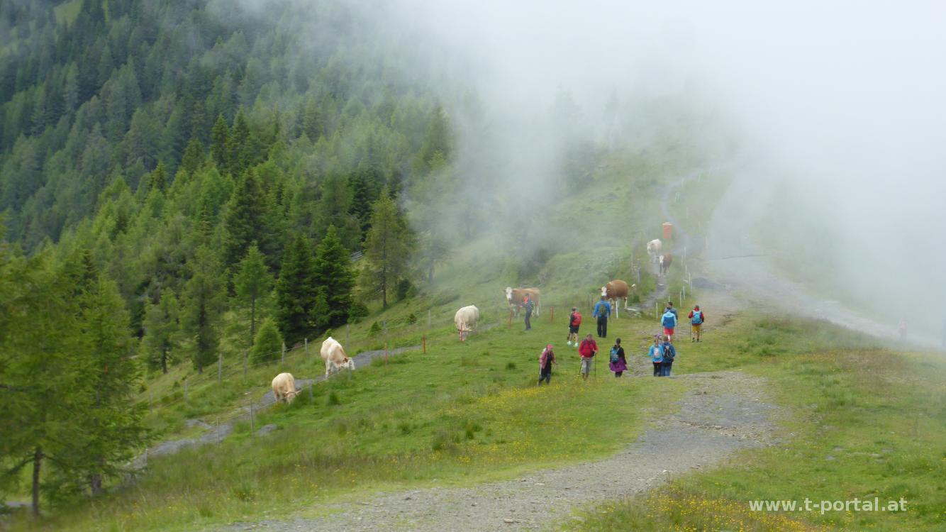 Der Ausblick ist eingeschränkt und der Wind pfeift, also machen wir uns nach kurzer Stärkung bald wieder auf den Rückweg. Nach dem ersten Abstieg bewundern wir die Kühe, die es geschafft haben über den Zaun auf die Mountainbikestrecke zu kommen. Die Mountainbiker sind davon nicht sehr begeistert. Wir wenden uns nach links und gehen vorbei an der Rossalmhütte Richtung Strohsack. Auf halbem Weg geht es nach rechts hinab. Inzwischen hat es etwas zu regnen begonnen und wir steigen am erdigen und teils rutschigen Weg ab. Hierbei queren wir ein paar Mal die Forststraße.