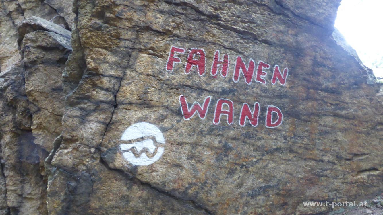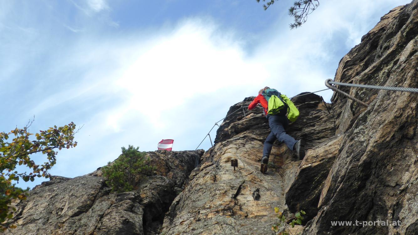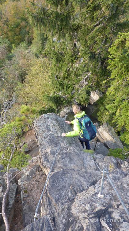 Hier genießen wir kurz den Blick zur Donau und gehen anschließend zurück zum Welterebesteig. Nach etwas auf und ab geht es bald mehr bergan zu einer kleinen Scharte. Nach dem nächsten eher flachen Stück zeige ich Klaudia noch die Hütten etwas oberhalb vom Pfad, etwas später biegen wir weglos ab und steigen über den Hang hinauf. Wir umgehen die Felsen und landen so direkt beim Einstieg des Klettersteigs zur Hirschwand. Oben weht der Wind, also geht es gleich auf der anderen Seite wieder hinab und weiter zum Seekopf. Das Gerüst der neuen Warte steht bereits und zwei Kletterer versuchen sich im Besteigen der glatten Stahlträger.