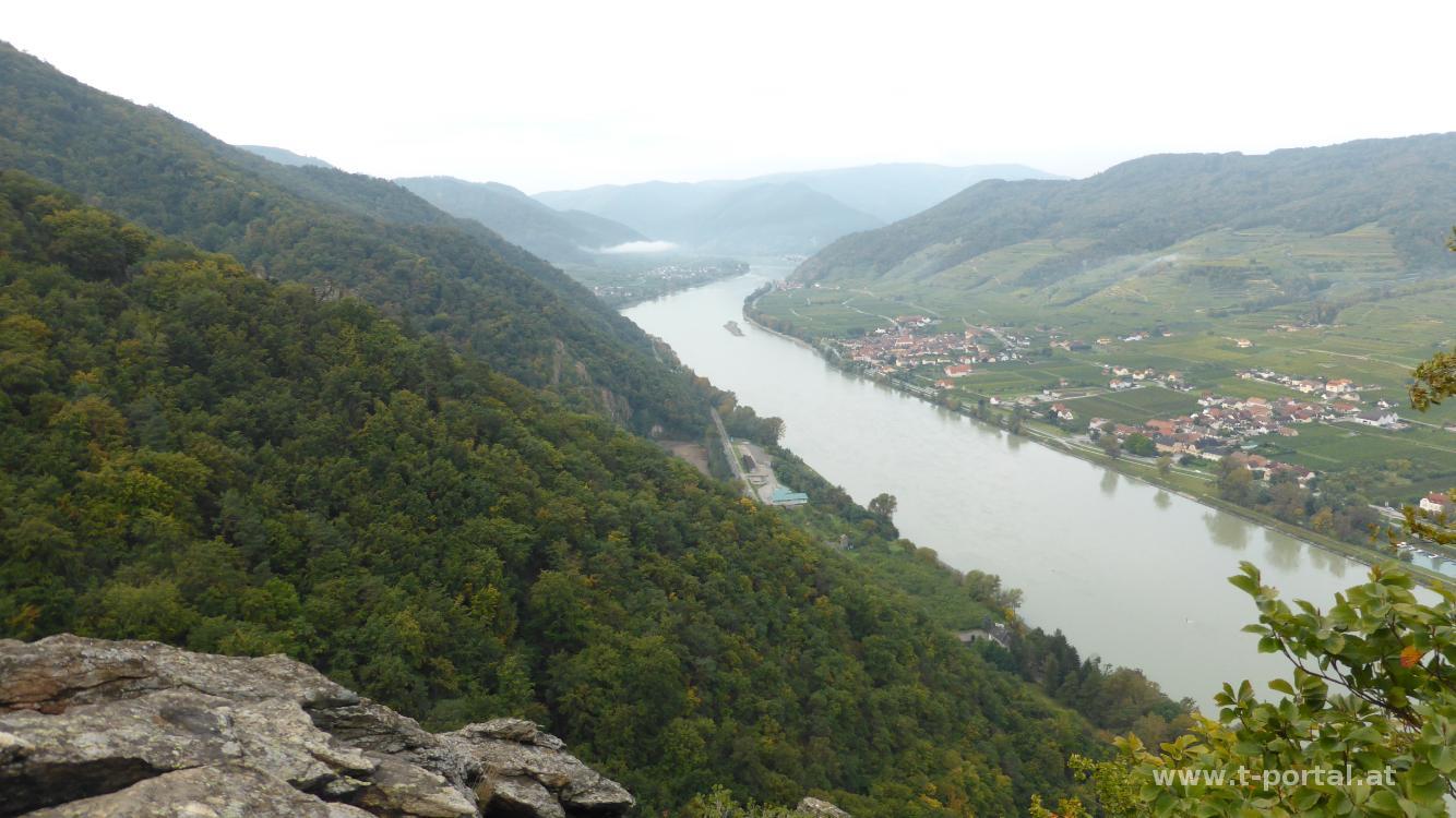 Auch heute sind wir wieder in der Wachau und wiederholen eine Runde aus dem Frühjahr. Wir sind extra früh aufgestanden, da am Nachmittag das Wetter schlecht werden soll. Wir starten beim Parkplatz der Fähre über die Donau neben der Wachauer Nase. Von dort geht es einmal über die Bundesstraße und durch den Wald gleich mal hinauf bis zu einem Aussichts- und Gendenkplatz. Nun im Wald flacher dahin bis zu einer Forststraße. Dieser folgen wir nun um Kurven und Kehren immer leicht ansteigend weiter neben Felsen und Bäumen dahin. Die Straße wird zu einem Pfad und nach den nächsten paar Felsformationen biegen wir nach rechts hinab zum Falkenhorst.