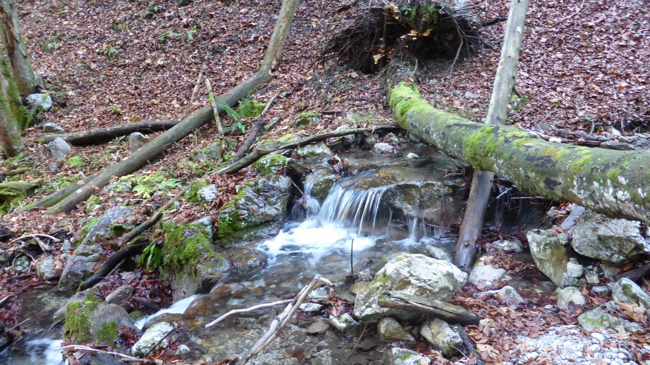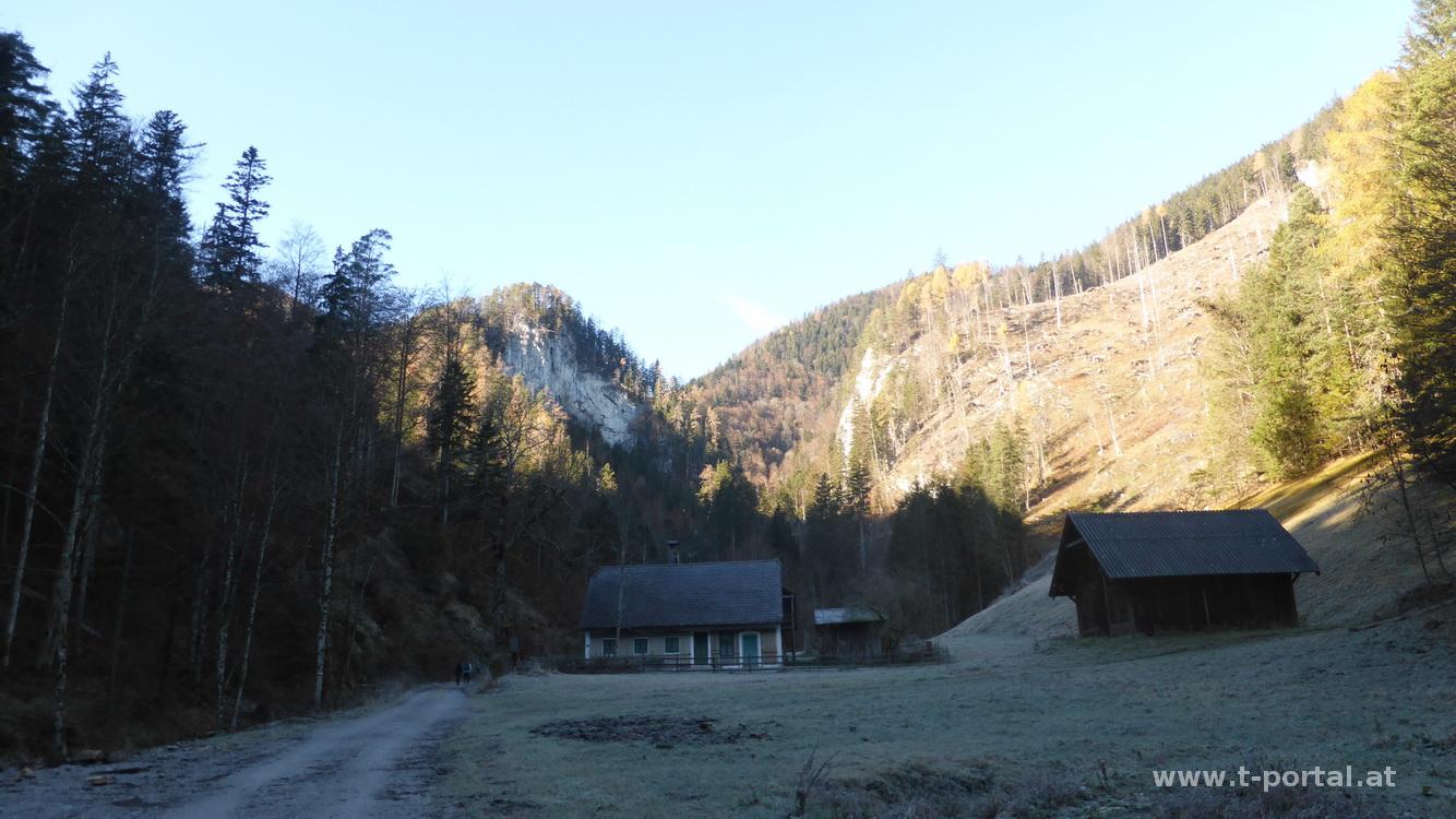 Nach dem Eisenstein und dem Türnitzer Höger fehlt uns von den Türnitzer Klassikern noch der Tirolerkogel. Wir starten beim eisernen Tor und wandern entlang der Forststraße Richtung Falkenschlucht. Obwohl es bei der Anreise noch nach dickem Nebel aussah, wird es hier bald heller und etwas blauer Himmel kommt hervor. Es geht vorbei an der Mariengrotte, einigen Wallfahrergedenken und wenigen Häusern (da wurden wohl die letzten Jahre ein paar abgetragen), bis wir den Eingang zur Falkenschlucht erreichen. Bevor wir diese betreten, machen wir aber noch einen kurzen Abstecher zur Innerebengrotte, bei der das Wasser direkt aus dem Fels schießt. Anschließend geht es durch die Schlucht aufwärts. Anfangs auf Waldpfaden und viel Laub erreicht man später einige Holzstege. Danach führt der Weg noch ein paar Mal über den Bach und später wieder zur Forststraße in Richtung Mariazell. Dieser folgen wir nun leicht aufwärts und gehen bei der nächsten Möglichkeit nicht gerade aus den Pilgern nach, sondern scharf nach rechts hinauf. Bald wandern wir wieder in der Sonne, durch Wald und über Laub. Wir erreichen die Kreuzung mit dem Weg aus dem Dachsental und wenden uns nach links auf die Wiese. Nach ein paar Minuten nutzen wir den Aussichtsplatz neben dem Weg für eine erste Pause.