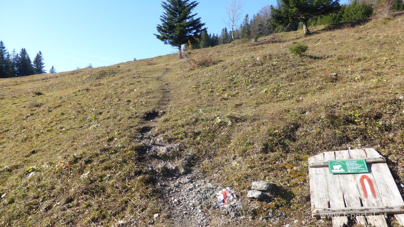 Anschließend geht es über die Wiese und vorbei am Lackenkogel zurück auf den Weg, kurz hinab und im schattigen Graben aufwärts. Vorbei geht es an einer gefrorenen Kuhlacke zurück in die Sonne. Hier wenden wir uns nach rechts zum Waldrand und folgen den Markierungen durch den Wald hinauf. Oben angekommen sehen wir auch schon das Annaberger Haus und stehen wenig später beim Gipfelkreuz. Nachdem hier einiges los ist, geht es auch gleich weiter. Ein kurzes Stück wieder hinab zur Straße und auf dieser Richtung Nordosten. Wir queren eine Wiese, steigen beim Wegweiser über den Zaun und machen uns auf den Weg zum Eibl. Zuerst noch ein Stück über die Alm, dann zwischen den Bäumen hinab bis zu einer Forststraße. Dieser folgen wir fast bis zum Ende, wo ein Weg nach links in den dunklen Wald abzweigt. Recht flott geht es hinab, zweimal ums Eck und dann geradeaus bis zur Bergrettungshütte Österleinbrunn. Die Wiese daneben liegt im Schatten und lädt nicht zum Rasten ein, also wandern wir auch gleich durch den Wald weiter. Das erste Stück ist es flach, dann leicht ansteigend zur nächsten Wiese, nochmal steiler hinauf und dann neben der Karnerhofspitze im sonnigen Hang dahin. Neben ein paar alten knorrigen Bäumen legen wir noch eine Rastpause ein.