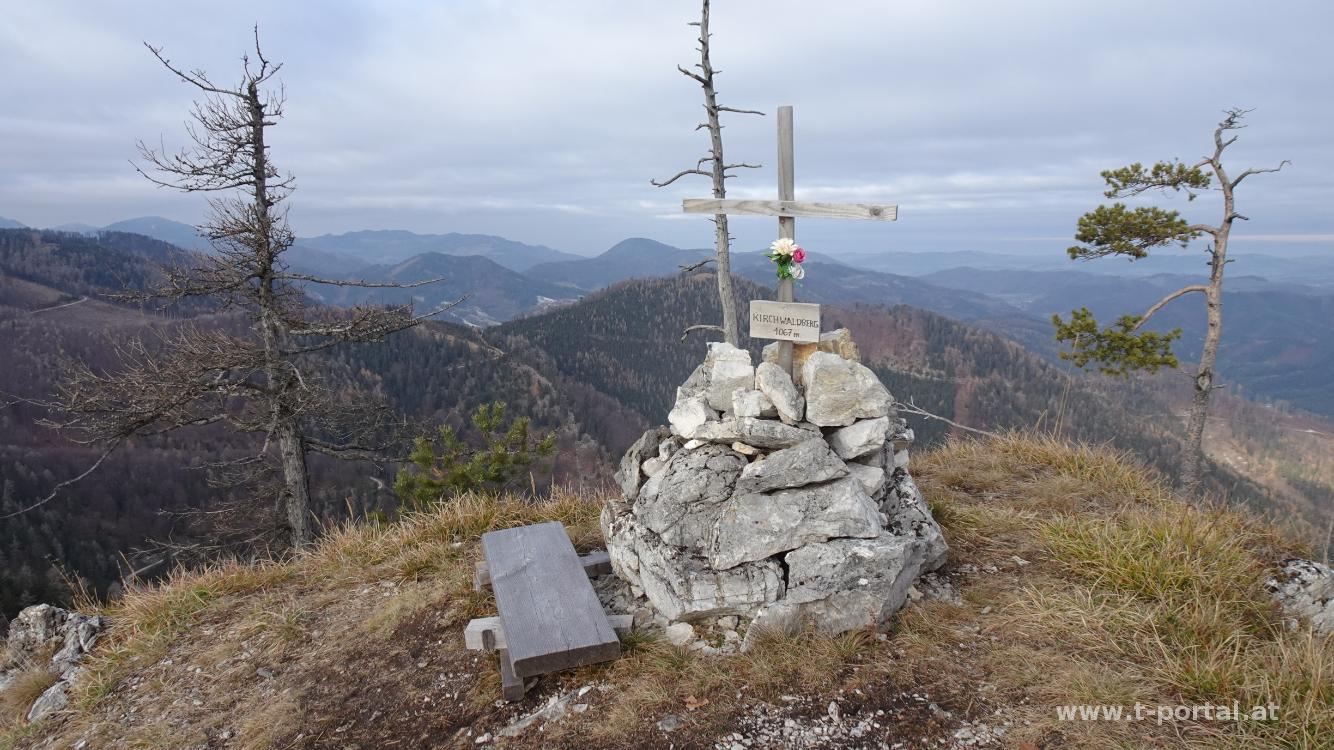 Nach einem kurzen flachen Stück geht es gleich wieder bergauf und anschließend auf und ab am Kamm dahin. Abseits des Wanderwegs führt ein Trampelpfad hinauf zum Kirchwaldberg. Wir schauen einmal durch die Gegend, sehen das Schutzhaus am Kieneck, die Araburg, unser Ziel den Unterberg und viele Wolken. Auf der anderen Seite geht es hinab und zurück auf den Normalweg. Es geht nochmal hinab und auf einem Schotterpfad wieder aufwärts. Von rechts kommt der Weg aus dem Adamstal an, wir machen einen kurzen Abschneider und folgen dem Waldpfad weiter aufwärts. Wenig späterverlassen wir den markierten Pfad und folgen nach rechts einem Trampelpfad hinauf. Durch den Wald geht es auf die Schipiste und an Schneeresten vorbei weiter hinauf. Nach einem Stück über die Wiesen erreichen wir das Gipfelkreuz. Trotz des Wetters ist dieses heute gut besucht.