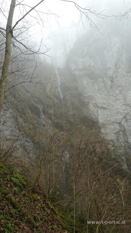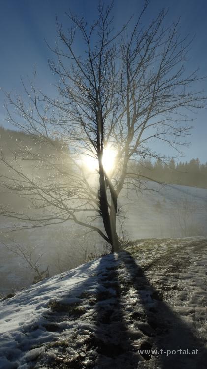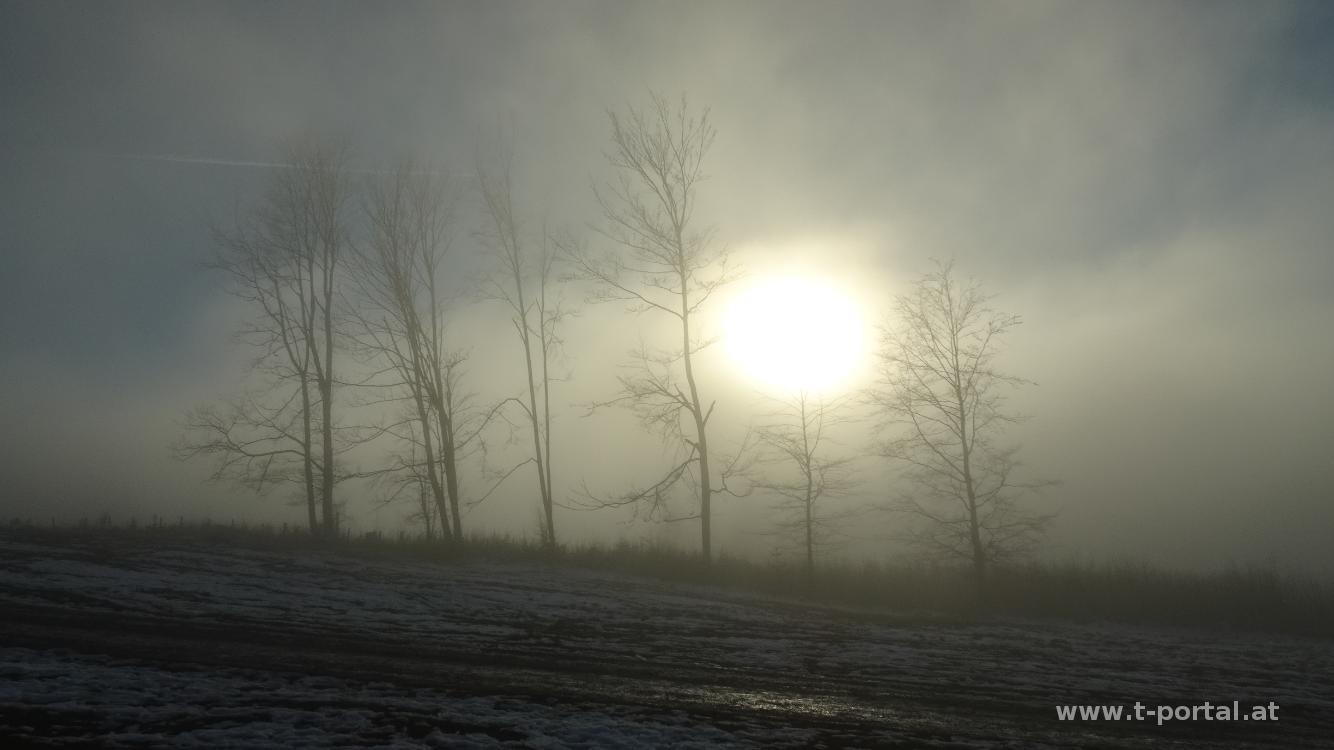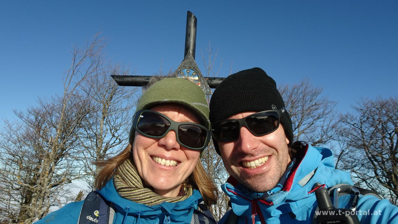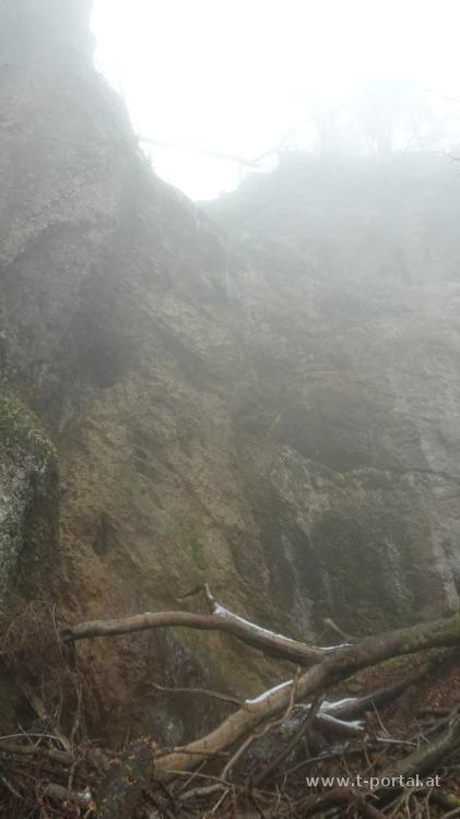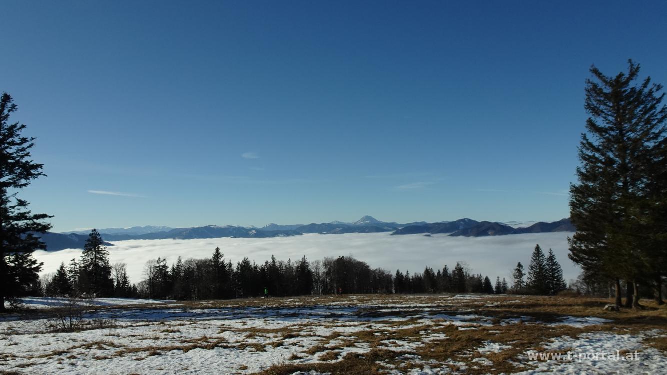Wir gehen noch ein Stück weiter und kommen zum Abzweiger zum kleinen Wasserfall. Wir steigen ein Stück ab, rutschen über eine Brücke und stehen beim nächsten Wasserfall. Durch den frostigen Wald geht es nun weiter aufwärts, bis wir die Forststraße queren und dem Jägersteig weiter aufwärts folgen. Wir kommen beim Karlstein vorbei und nach dem nächsten Anstieg erreichen wir wieder eine Straße. Hier wird es langsam heller und die Sonnenscheibe taucht zwischen den Nebelschwaden auf. Der Straße folgen wir zur Lilienfelder Hütte und anschließend über die Wiesen weiter aufwärts. Wir haben die Nebelzone hinter uns gelassen und wandern in der Sonne aufwärts. Kurz vor der Bergstation der Seilbahn entdecken wir ein freies Bankerl und genießen den Ausblick in die Berge. Nach Stärkung geht es auf der Straße weiter aufwärts, bis wir rechts zur Klöstertreppe abbiegen und auf schattigem und somit eisigem Pfad zum Muckenkogel aufsteigen. Von hier blicken wir auf ein großes Nebelmeer in Richtung Nord und Ost.