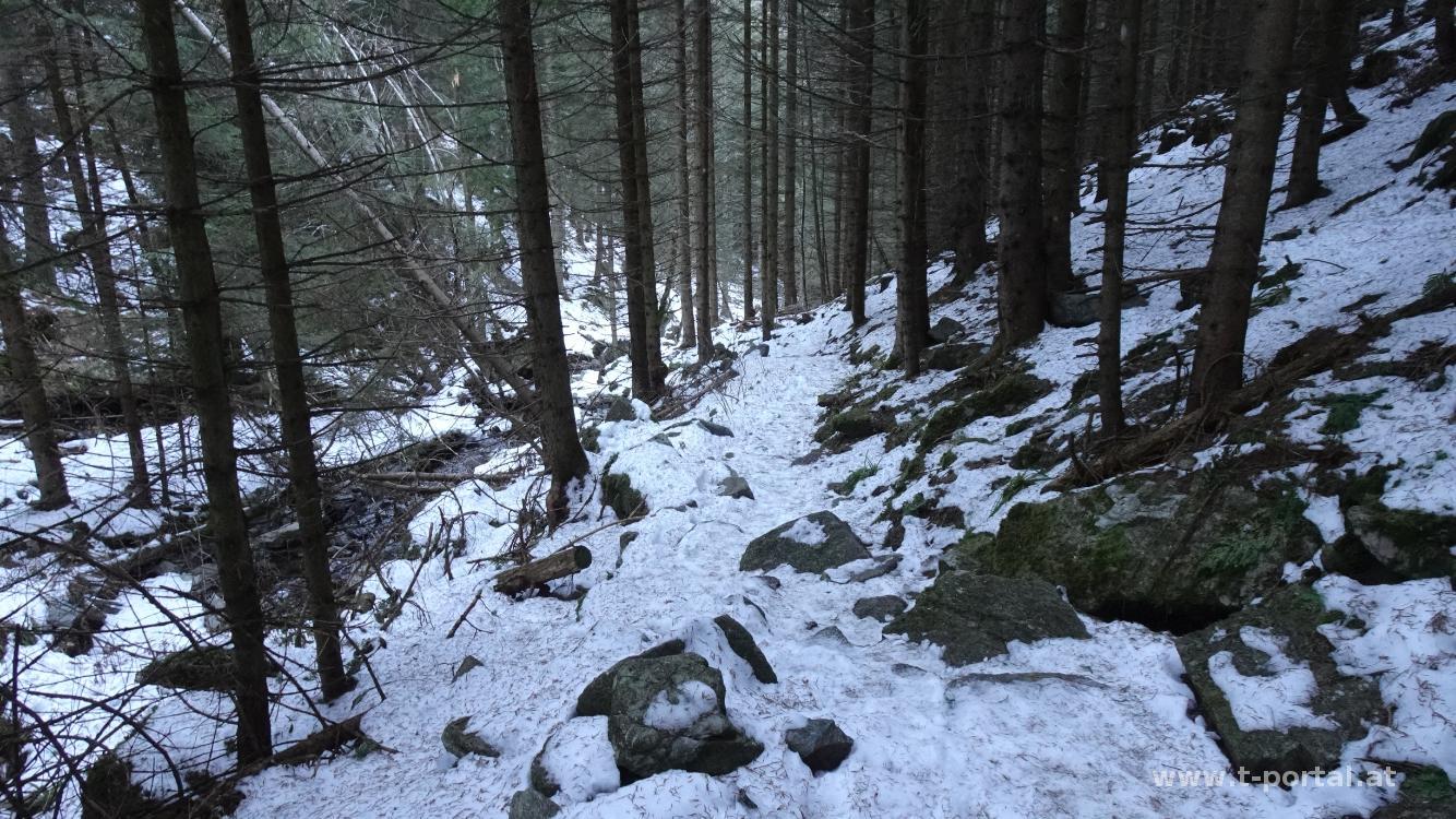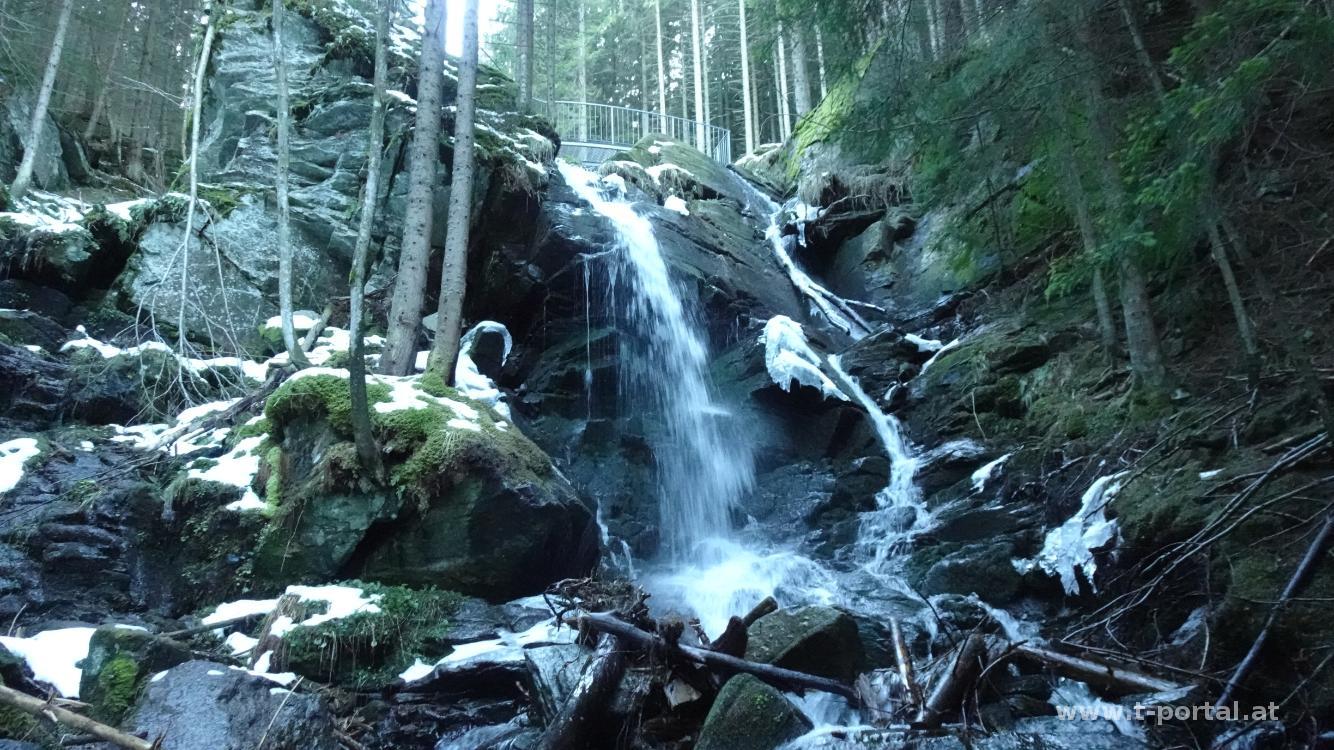 Nach diesem eher unspannenden Abstieg treffen wir auf eine Kreuzung und wählen den mittleren Weg, dieser führt uns nach einigen Metern zu einem Hinweisschild über den Wildwasserpfad Mariensee. Über eine eisige Treppe geht es nach links hinab zu einem Bach und rechts von diesem weiter abwärts. Unsere Schneeketten leisten uns am rutschigen Untergrund gute Dienste. Wir erreichen eine Unterstandshütte neben dem Wasserfall und machen noch ein paar Fotos. Neben dem Wasserfall geht es dann hinab, noch ein Stück entlang des Bachs und zu einer Forststraße. Dieser folgen wir ein Stück, biegen dann jedoch wieder auf den Wildwasserpfad ab und gehen neben dem Bach und ein paar Informationstafeln zurück zum Ausgangspunkt.