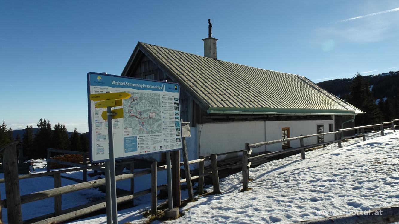Von einer Wechsel-Wanderung reden wir schon lange, aber irgendwie war es uns immer zu weit oder zu windig oder es hat uns wo anders besser gefallen. Heute möchten wir nochmal dem Nebel entfliehen und windig soll es auch nicht sein und bei näherer Betrachtung ist es auch nicht weiter weg, als andere Touren. Bei unserer Anreise durch Mariensee wird der Schnee am Straßenrand immer mehr und das letzte Stück zum Parkplatz ist sogar Schneefahrbahn. Wir ergattern gerade noch einen Parkplatz und machen uns auf den Weg. Unerwarterweiße ist hier am Talende kein Nebel mehr und hinter den Bäumen lacht uns immer wieder die Sonne an. Wir gehen ein Stück auf einem Forstweg, um eine Kurve, queren eine verschneite Wiese und folgen dann dem Wanderweg weiter aufwärts. Weiter vorne folgen wir nicht dem gemütlicheren Almweg, sondern biegen nach links auf den Schindelsteig ab. Im Schatten treffen wir nun immer wieder auf harten und eisigen Schnee, in der Sonne einen schönen Waldpfad. Der Weg quert ein paar mal die Forststraße. Weiter oben mündet der Almweg wieder ein und nach einer Wiesenquerung erreichen wir die Hütten am Marienseer Schwaig.
