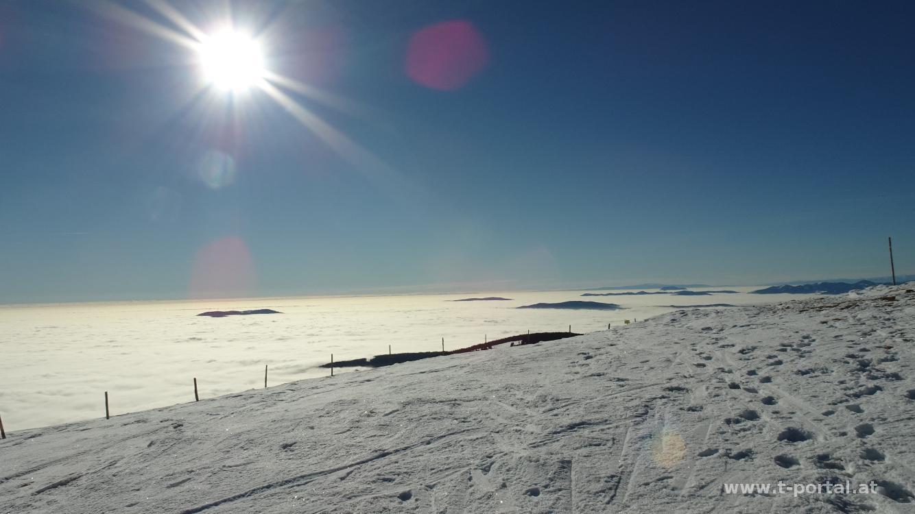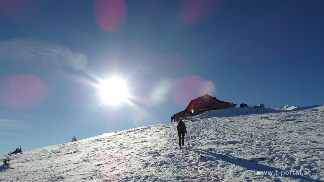Nachdem wir heute zum ersten Mal unsere Schneeketten mithaben, schnallen wir die um unsere Schuhe und wandern über die Pisten weiter aufwärts. Unterwegs treffen wir auch Wanderer mit Schneeschuhen und Tourengeher. Bald rückt das Wetterkogelhaus am Hochwechsel ins Blickfeld. Es dauert aber doch noch, bis wir über verschneite Wiesen und meist harten Schnee den Gipfel erreichen. Das Panorama ist beeindruckend, die Gipfel unter etwa 1100 Meter verstecken sich unter der Nebeldecke. Wir suchen uns einen Rastplatz und stärken uns mit der mitgebrachten Jause.