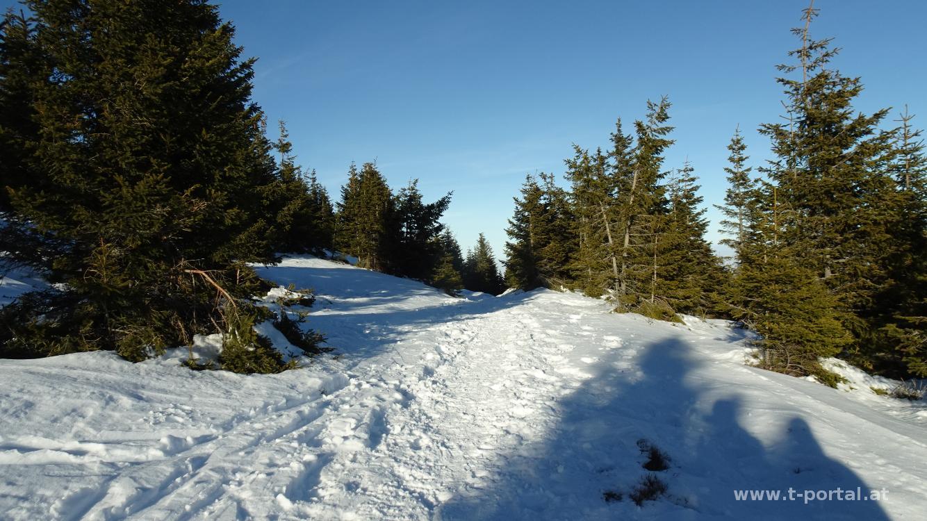 Danach geht es Richtung Norden am breiten Kamm dahin. Nach längeren leichten Abstieg geht es nochmal hinauf zum Umschussriegel und anschließend über einen Waldgasse hinab zur Langlauf Loipe. Dieser folgen wir nun etwa einen Kilometer und biegen dann nach links ab. Nun entlang von Ski und Schneeschuhspuren weiter abwärts. Wir erreichen die nächste Kehre und folgen der Straße weitere zwei Kilometer abwärts.