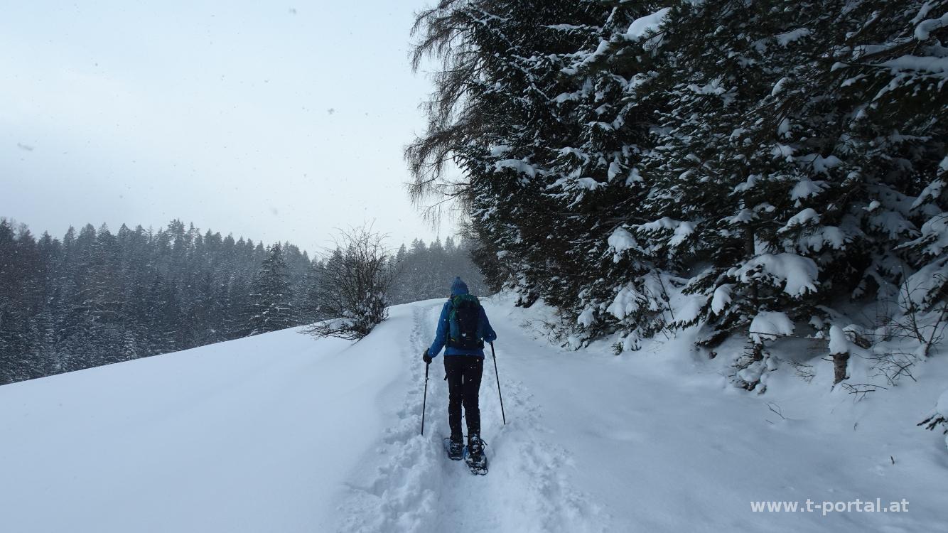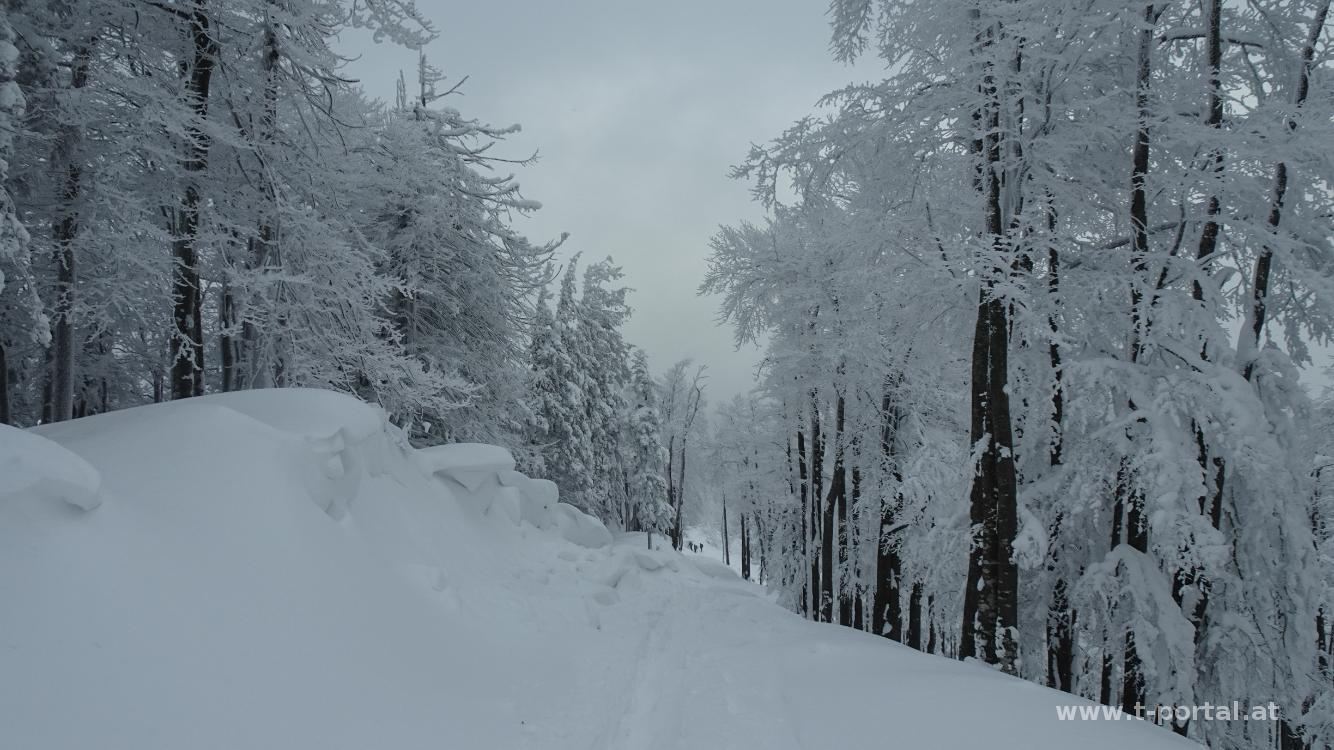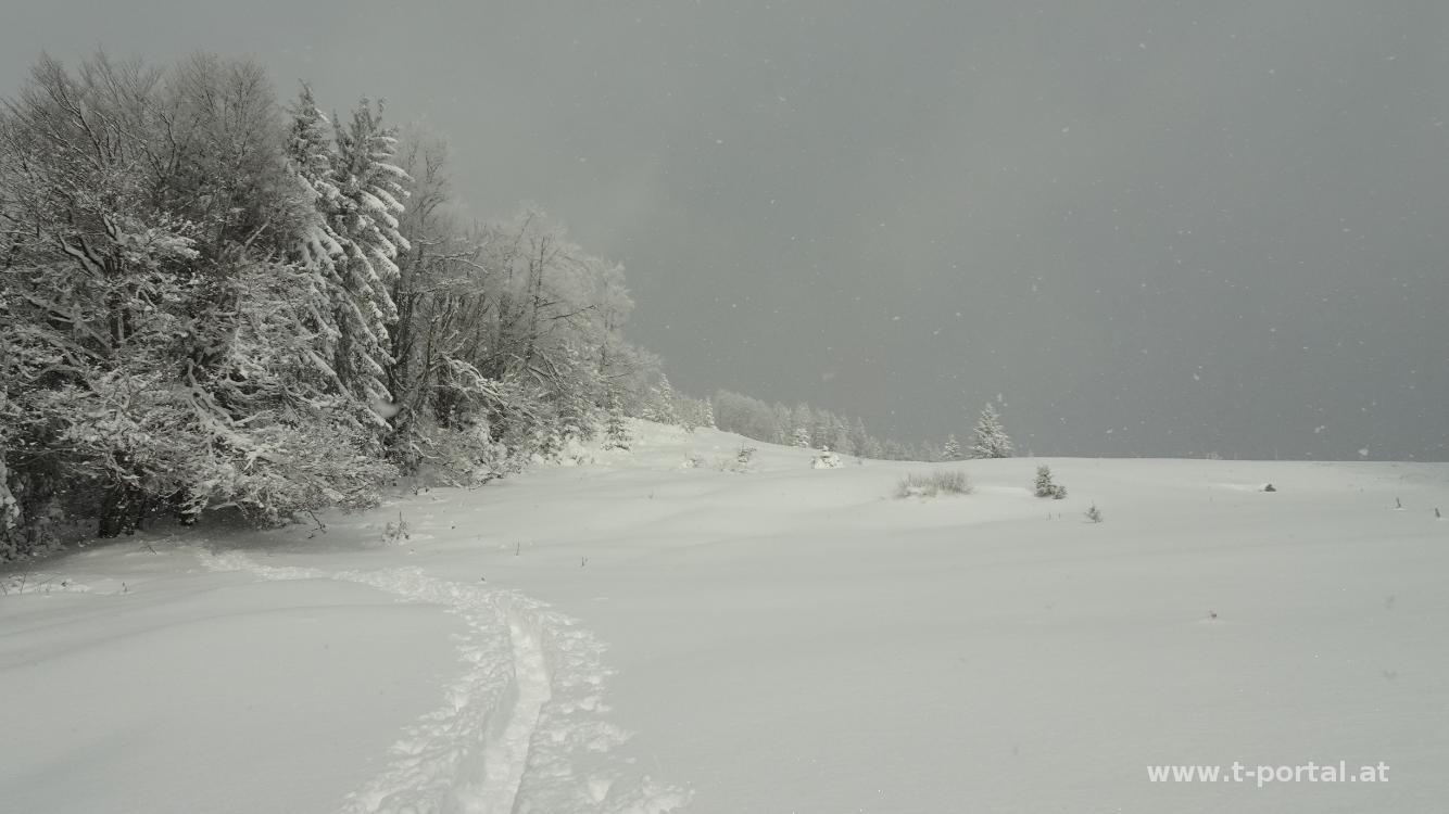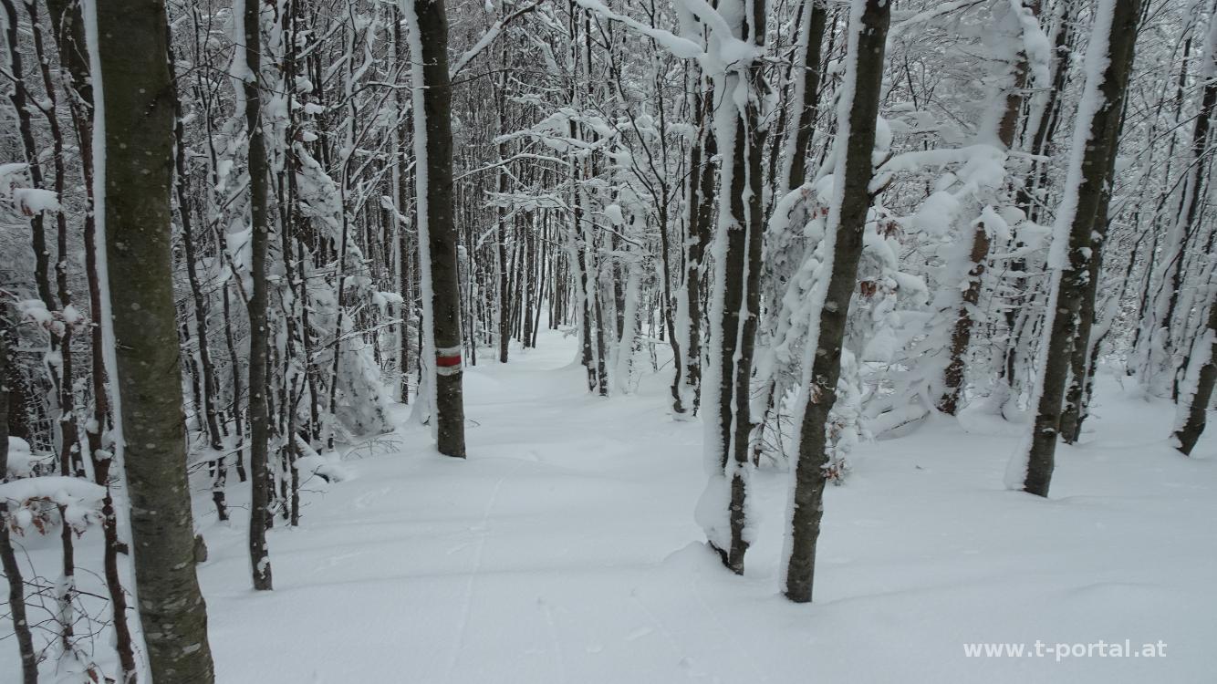 Anschließend geht es vorbei am Kreuz und weiter Richtung Osten. Auch hier gibt es nun bereits Spuren. Es geht vorbei an den Wechten neben der Straße und dann über eine Wiese flott hinab. Hier überholen wir auch die drei Wanderer von vorhin. Der Weg führt wieder in den Wald und in einer schmalen Schneiße im meist tiefen Schnee hinab. Weiter vorne treffen wir auf zwei weitere Schneeschuhwanderer, die die bisherige Abstiegsspur gezogen haben. Somit sind nun wir mit der Spurarbeit dran. Kurz geht es ein paar Meter hinauf und dann im tiefen Schnee weiter hinab. So erreichen wir erneut eine Forstraße und die Kreuzung beim Hammerleck. Wir wenden uns nach rechts um dann gleich wieder nach links hinab der roten Markierung nach Richtung Rohr am Gebirge zu folgen. Im tiefen Schnee rutschen wir hinab und erreichen eine Wildfütterungsstelle und auch wieder die Forststraße. Dieser folgen wir nun hinab bis zur Bundesstraße. Hier kommen die Schneeschuhe wieder an den Rucksack. Auf der Bundesstraße und durchs Dorf geht es zurück zum Start.
