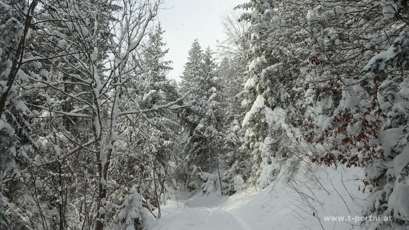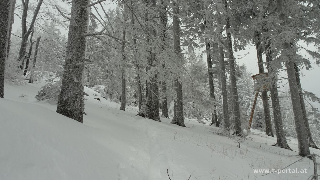 Weiter oben erreicht man wieder eine breitere Forststraße, für uns geht es aber gerade aus nach Westen weiter, wo der Wanderweg in den Wald hinein führt. Der Weg wird nun etwas anspruchsvoller und steiler. Während stellenweiße der Schnee recht tief ist, ist er an manchen Stellen schon wieder abgeblasen.Wir erreichen erneut eine Forststraße und folgen den Spuren weiter aufwärts. Später verlassen wir den Wald und kommen zu einer großen Wiese. Hier sehen wir zum ersten Mal drei weitere Schneeschuhwanderer. Es geht nochmal kurz durch den Wald und dann durch ein abgeholztes Waldstück in einigen Kehren aufwärts. Einer der drei Wanderer lässt uns vorbei, den anderen folgen wir im gemütlicheren Tempo bis zum Gipfel. Aussicht gibt es hier heute keine, wir rasten und stärken uns trotzdem kurz.