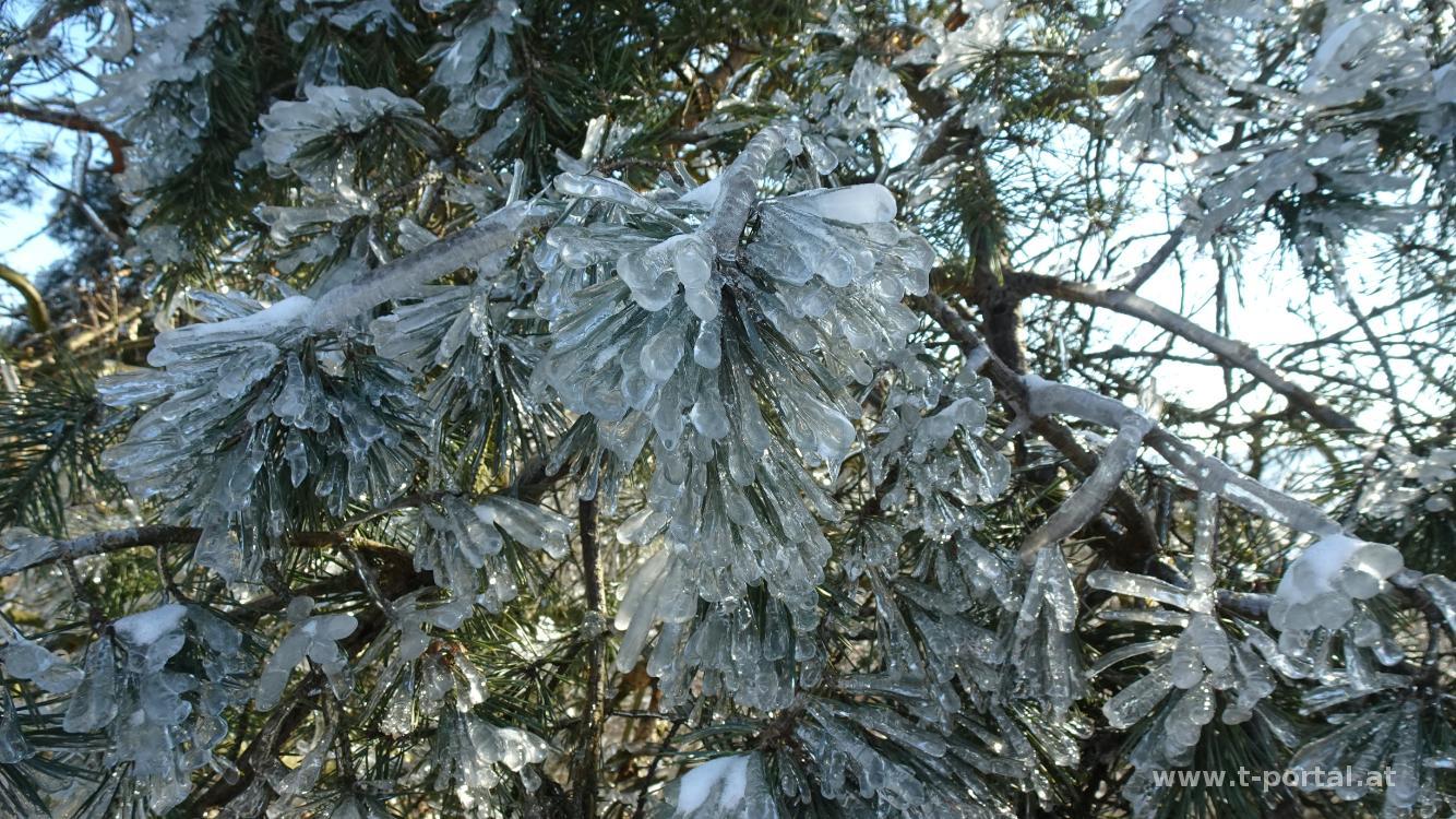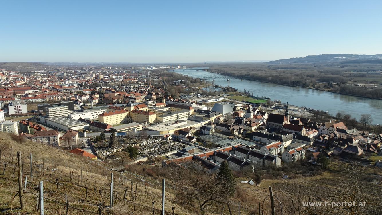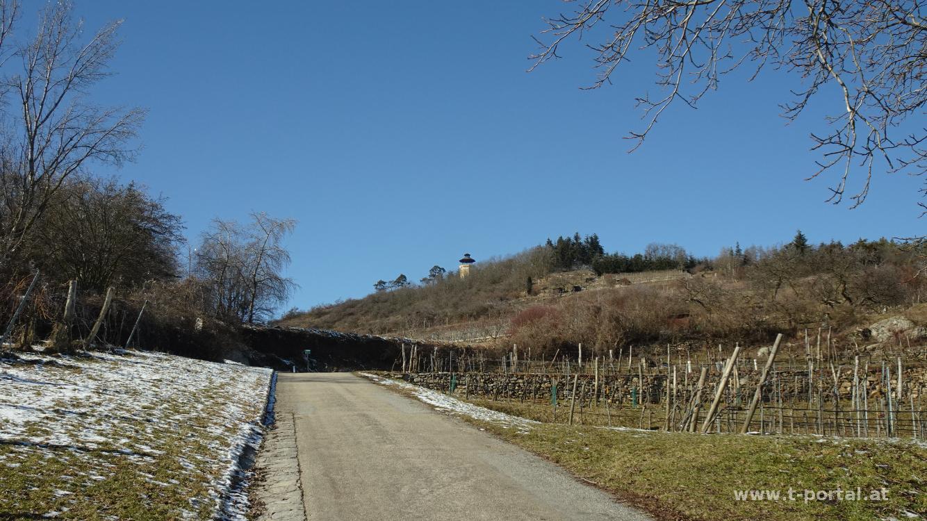Es ist wieder kalt geworden, wir wollen trotzdem eine kurze Runde drehen und in der Wachau soll es schön sein. Darum fahren wir nach Stein an der Donau und machen eine kurze Runde zur Donauwarte. Vom Rathausplatz geht es durch einen schmalen Durchgang und über Stiegen hinauf zum Rebentor. Hier nach links und gleich nach leichts rechts hinauf in die Weinberge. Nun folgen wir der Straße aufwärts und machen einen Abstecher zu einem Kreuz mit Ausblick nach Stein und Krems. Anschließend weiter hinauf, vorbei an vielen frostigen Bäumen und nach einem flacheren Stück auf der Straße nach links in den Wald und durch etwas Schnee zur Donauwarte.