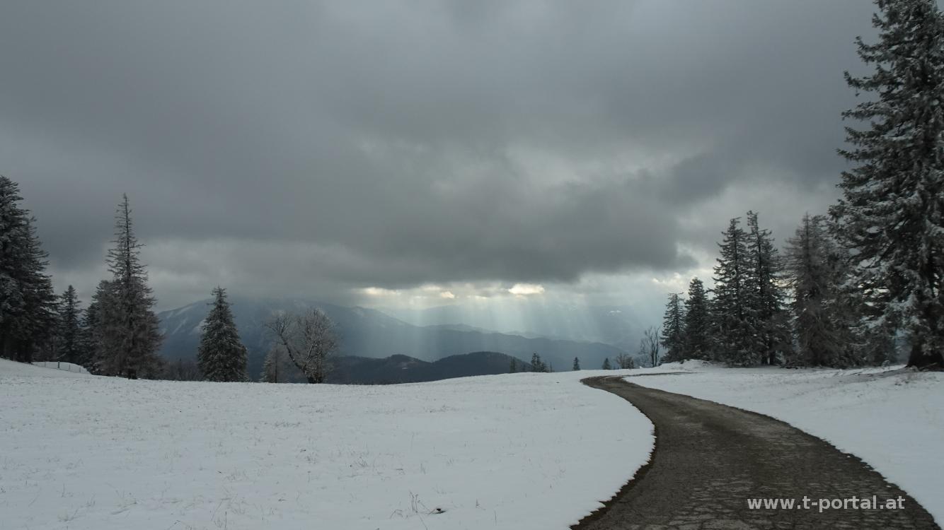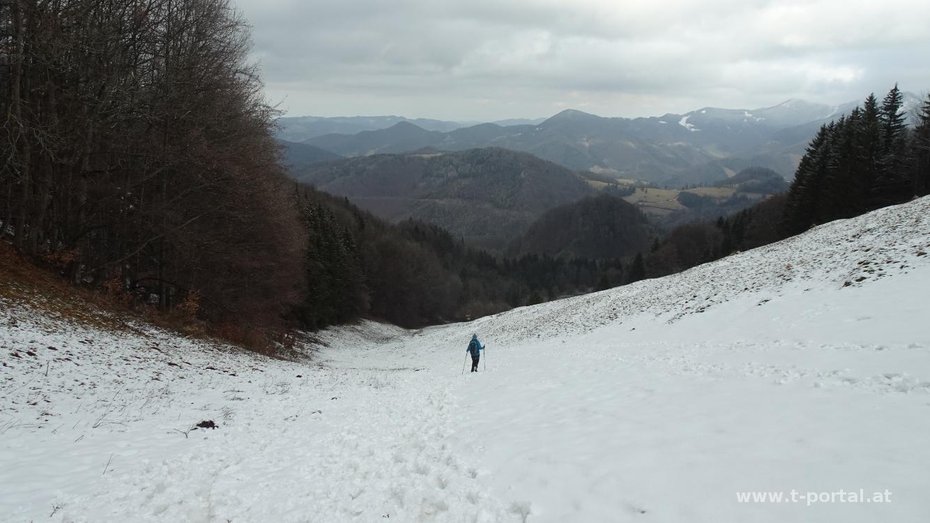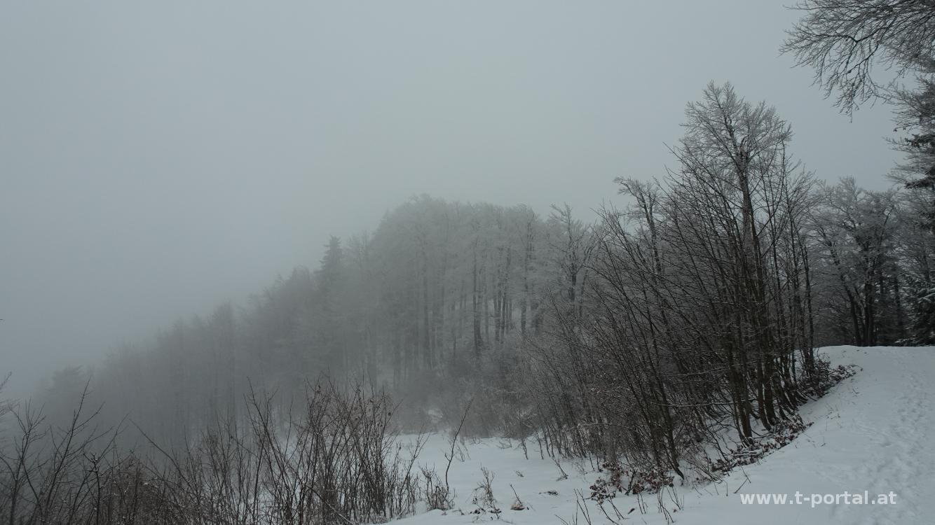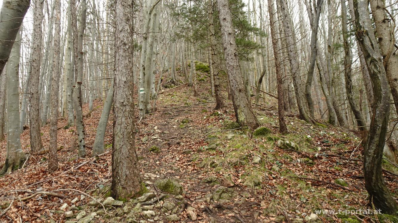 Mit Klaudia bin ich noch nicht aus dem stillen Tal auf den Muckenkogel gegangen. Das holen wir heute nach, da sich in der Gegend heute die Sonne zeigen sollte. Wir parken ein Stück hinter dem Krankenhaus in Lilienfeld und wandern ein Stück die Straße entlang. Dann geht es nach links etwas rutschig hinauf Richtung Ulreichshöhe. Die Warte auf der Ulreichshöhe hat schon mal bessere Zeiten gesehen, dafür hat man hier Ausblick hinab nach Lilienfeld. Es geht ein Stück durch dichten Wald und dann hinauf zum Spitzbrandkogel. Hier kommen wir bei vielen Schneerosen vorbei. Das Gipfelkreuz steht im Wald und bietet keine Aussicht, also geht es gleich auf der anderen Seite wieder hinab. Wir queren die Glatzwiese und schwenken auf den Jägersteig ab. Hier ist es gerne gatschig, heute nochmal mehr.