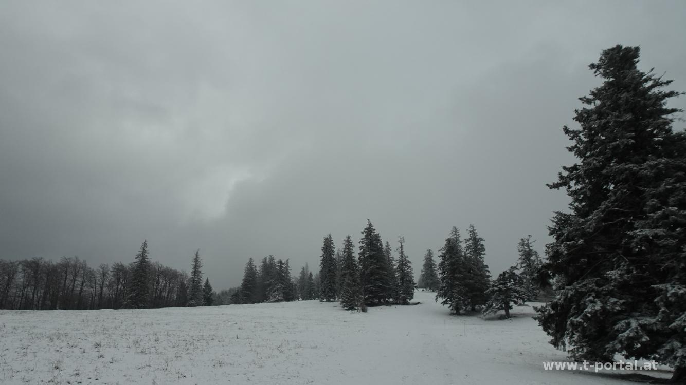Mit Erdklumpen an den Schuhen geht es durch den Wald weiter aufwärts. Wir folgen dem Jägersteig bis zur Lilienfelder Hütte und gehen dann über die Pisten/Wiesen weiter hinauf. Kurz vor der Bergstation des Lifts suchen wir uns einen Rastplatz. Sonne gibt es heute keine und somit fällt auch die Pause kurz aus. Wir marschieren auf der Straße noch weiter zum Sender am Muckenkogel, verzichten dann auf den weiteren Weg zur Traisner Hinteralm. Am gleichen Weg geht es hinab zur Lilienfelder Hütte und dann über die Wiese hinab.